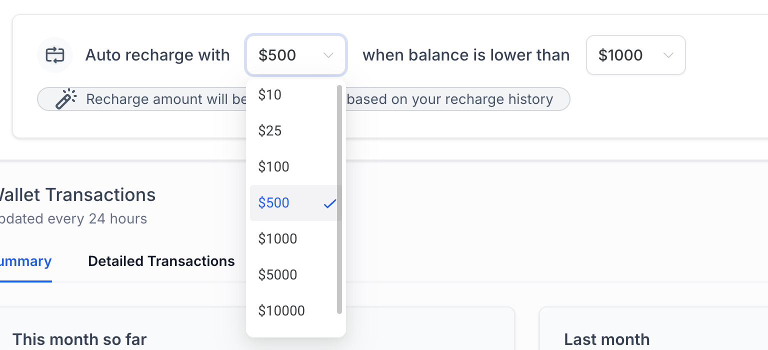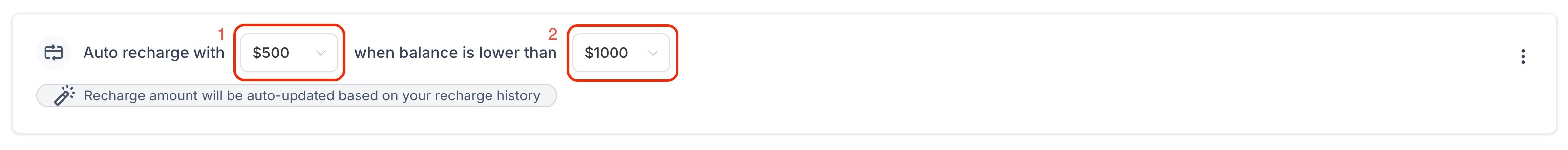 Auto Recharge automatically replenishes your wallet balance once it falls below a set threshold. When your wallet balance goes below the threshold amount you've specified (dropdown 2), the recharge amount selected (dropdown 1) is deducted from your payment method to refill your wallet.