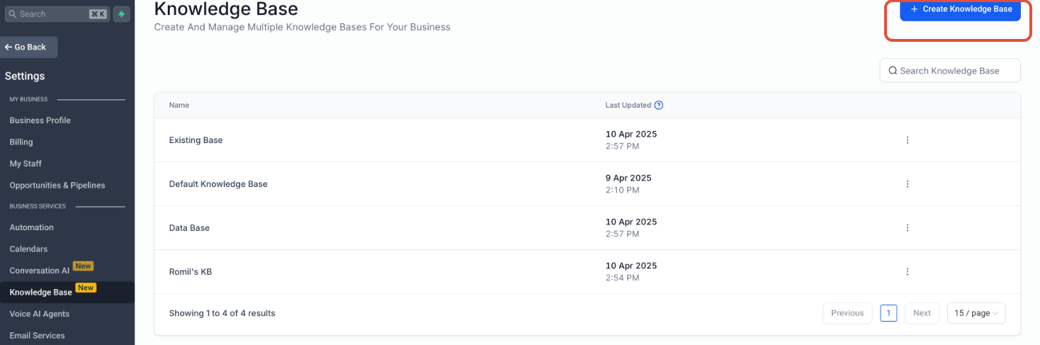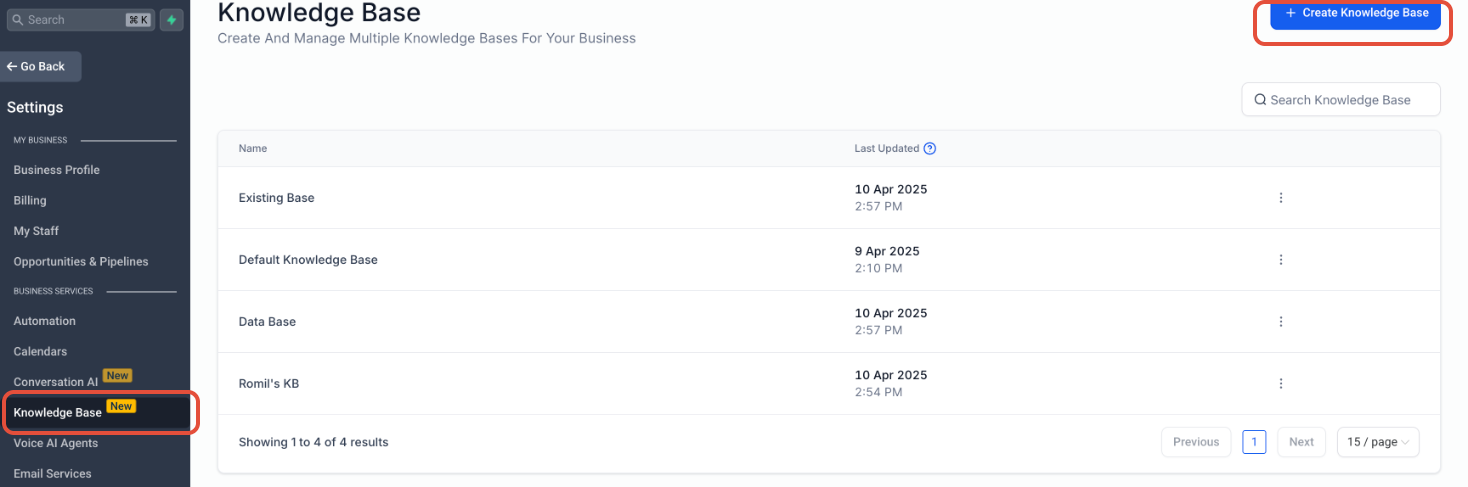Navigate to the new "Knowledge Base" menu item in the left navigation bar (as shown in the screenshot). This section houses all your KBs.