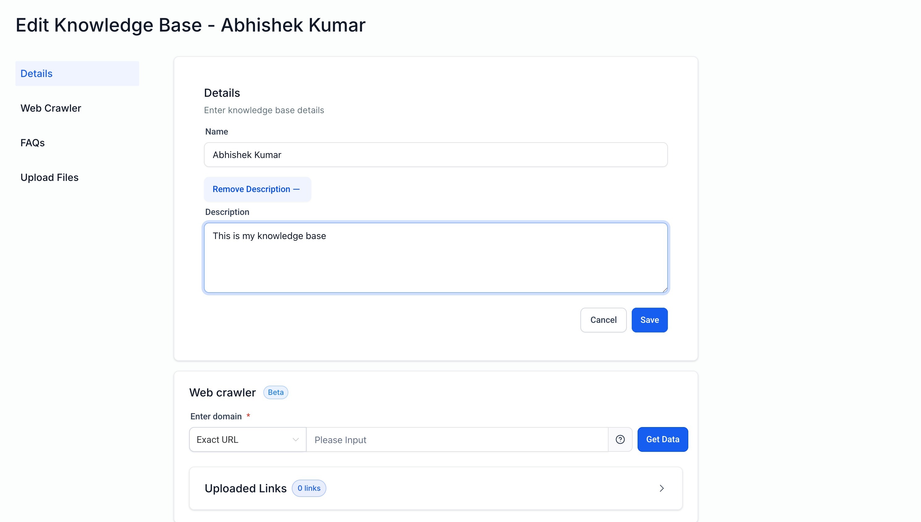 Note: The existing knowledge base that you have , you wont be able to delete it because it is by default used by the workflow bots . The multiple knowledge base support for workflow bots will be released soon