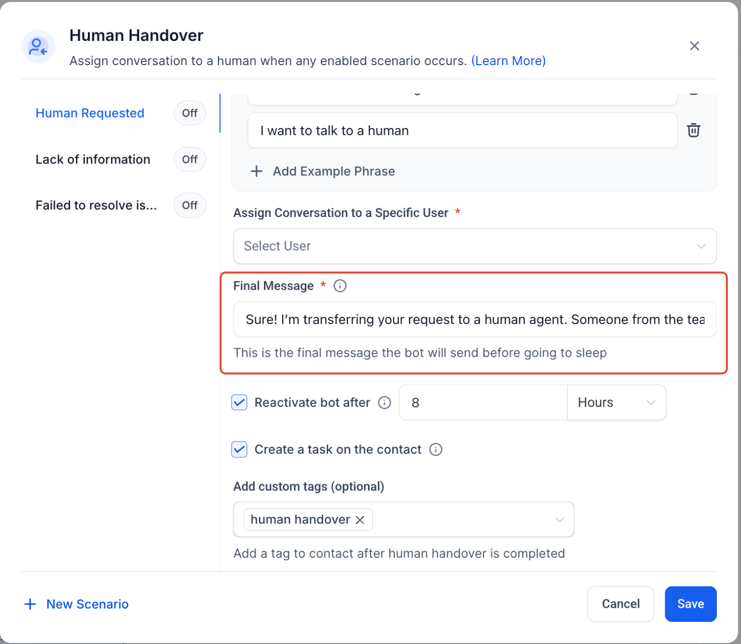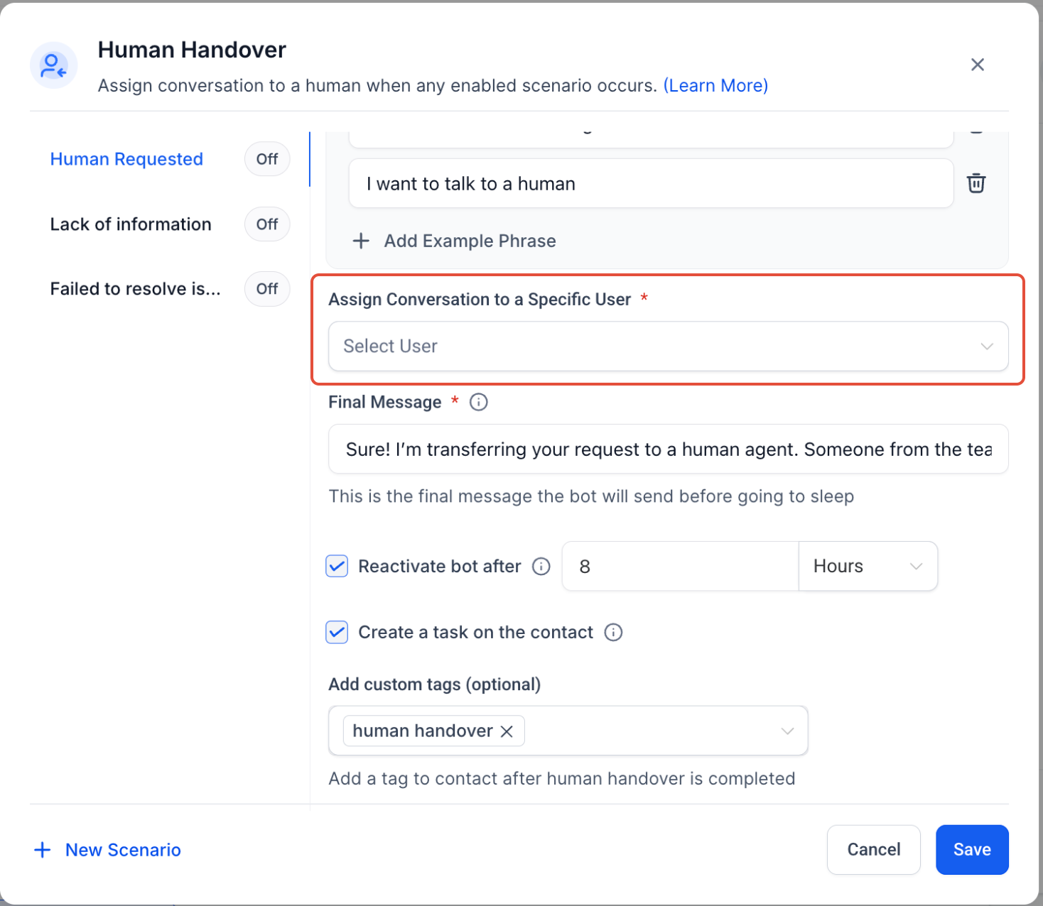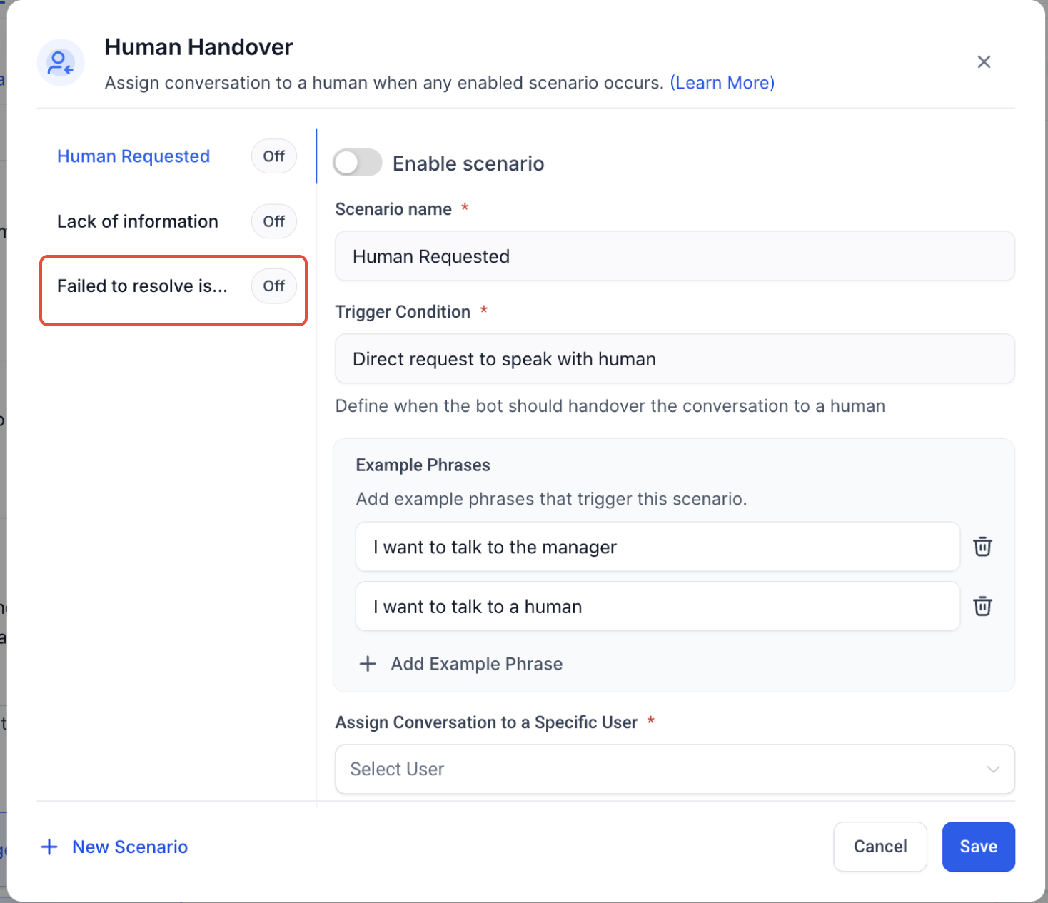 - Step 2: Select a Prebuilt ScenarioChoose from predefined conditions under which the bot will trigger a handover: