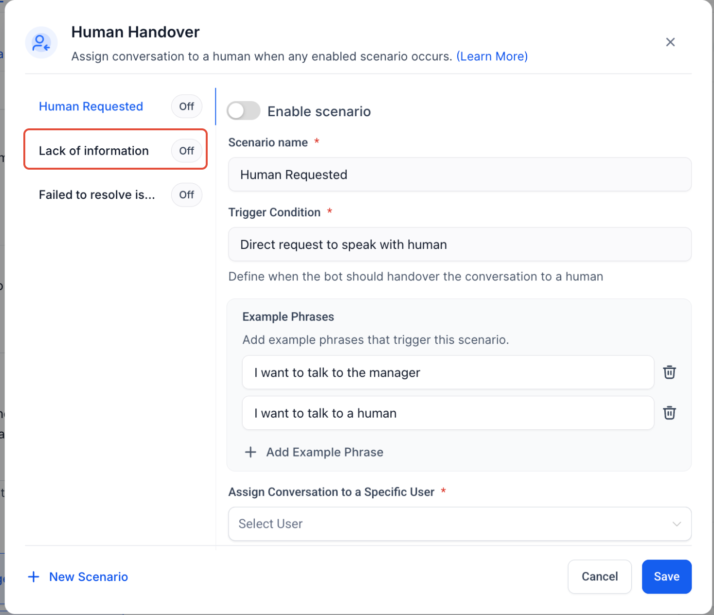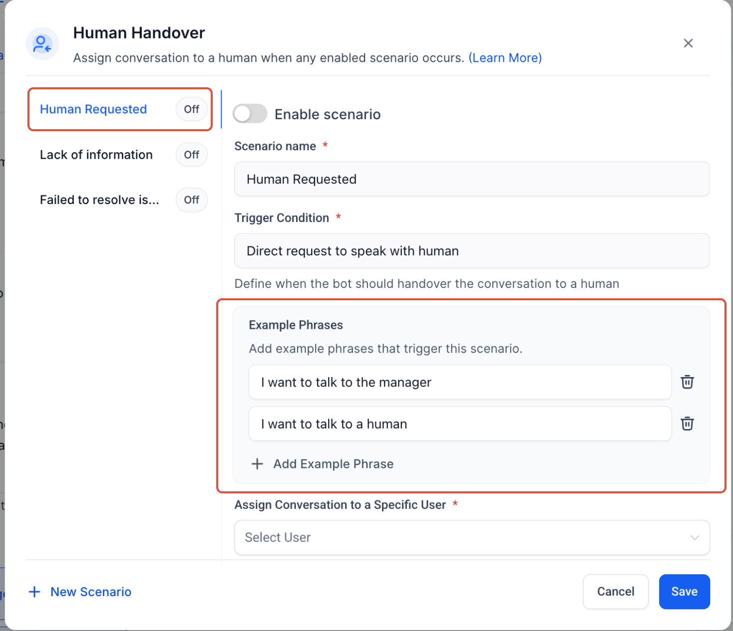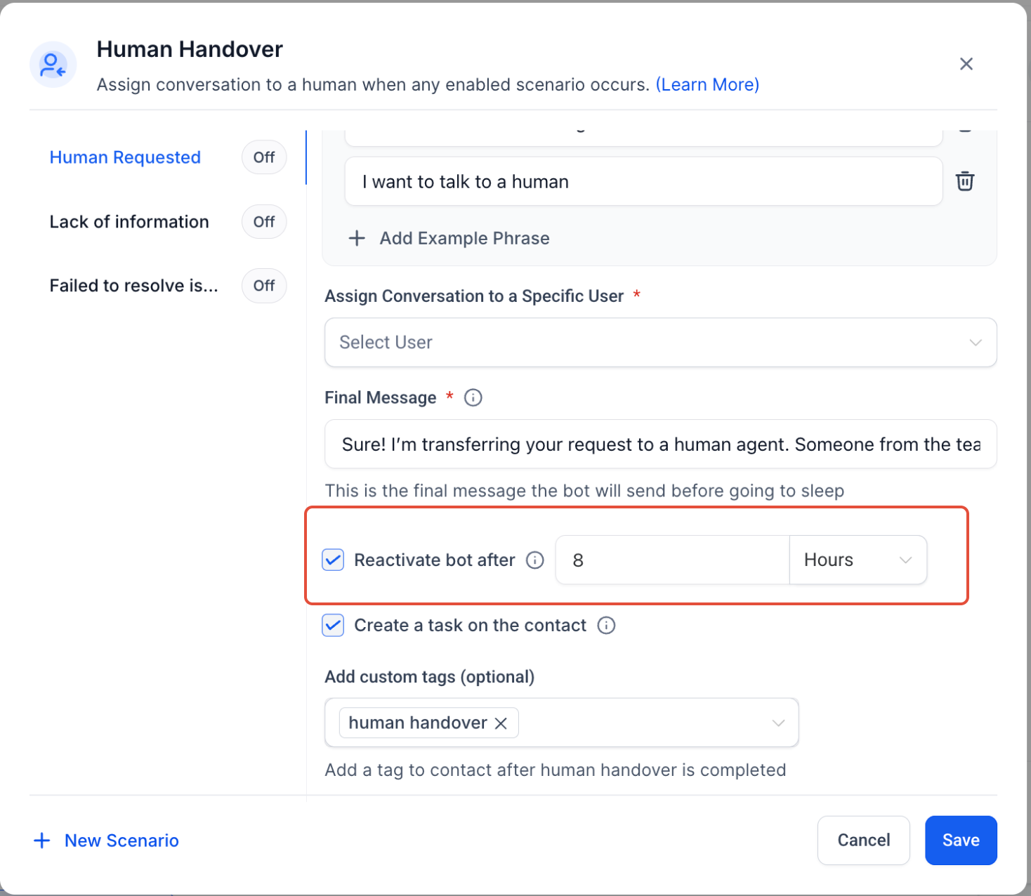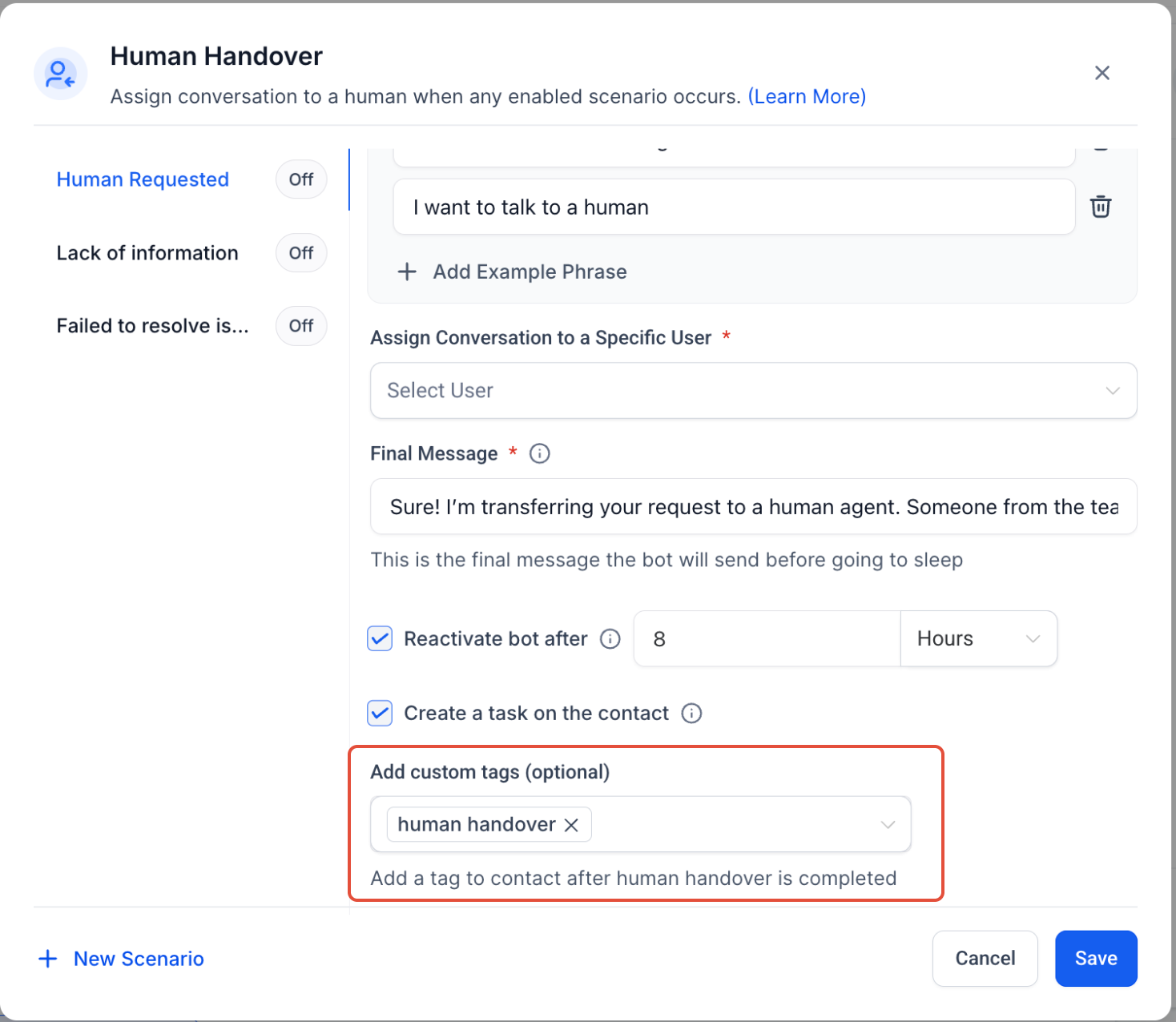 - Step 2: Select a Prebuilt ScenarioChoose from predefined conditions under which the bot will trigger a handover: