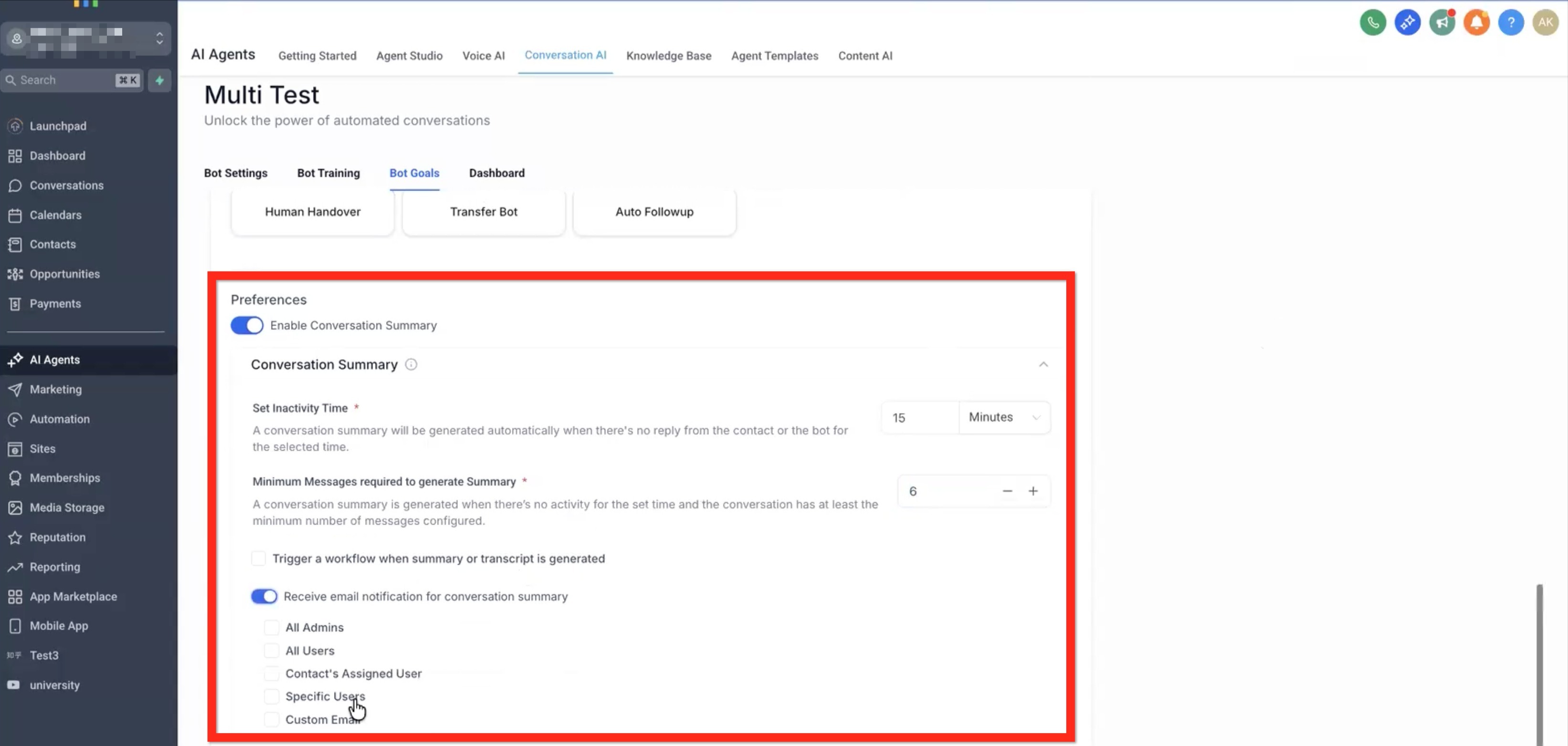 Bot Goals Preferences - Conversation Summary and Transcript are described in detail in this article: