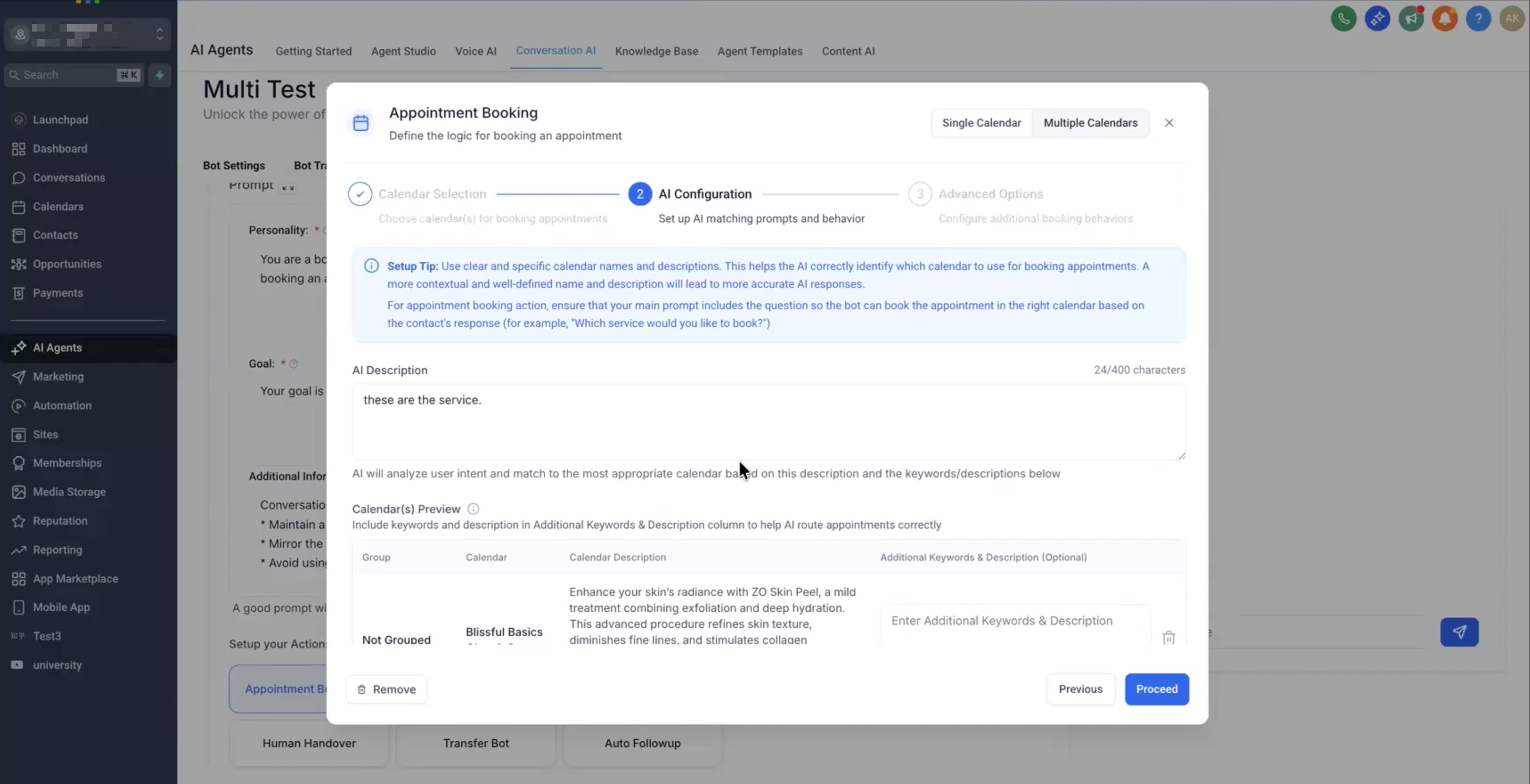 Proceed to AI Configuration and define your AI prompt (e.g., “Which type of consultation would you like to book?”).