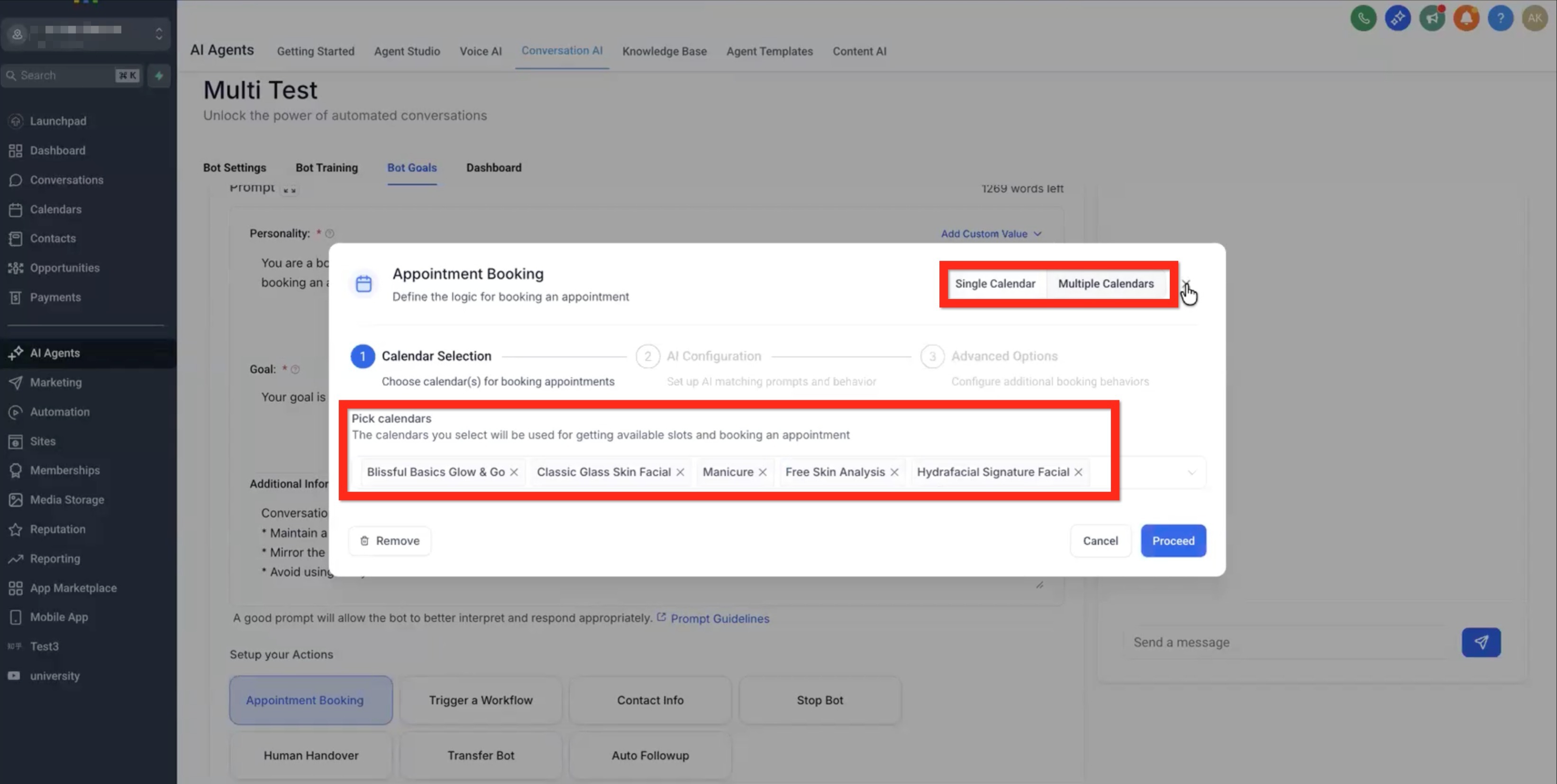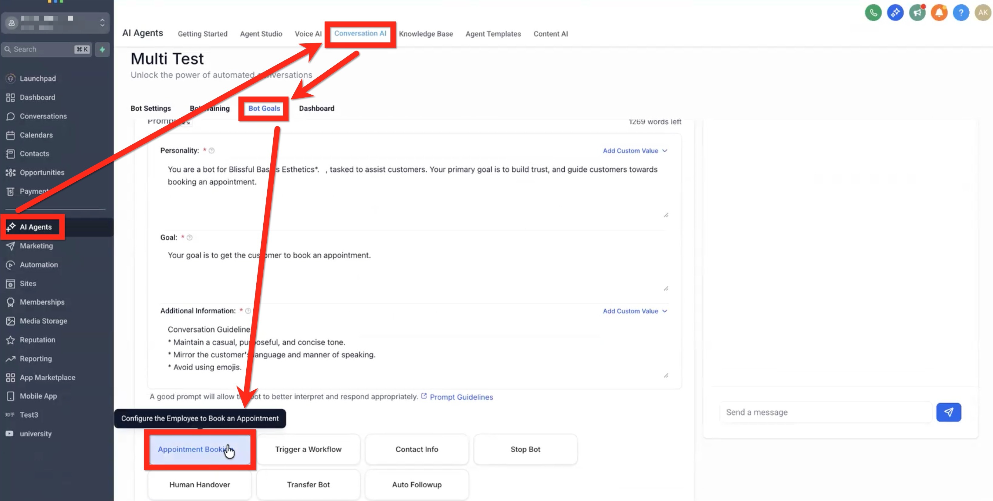 Navigate to AI Agents → Conversation AI → Bot Goals and select Appointment Booking.
