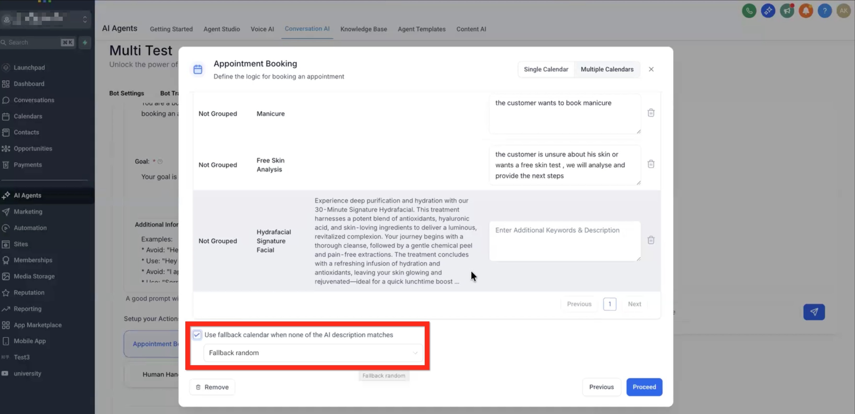 The fallback calendar acts as a safety net when none of the configured calendars match the user’s message. This ensures every appointment request is captured and booked, avoiding any lost opportunities.