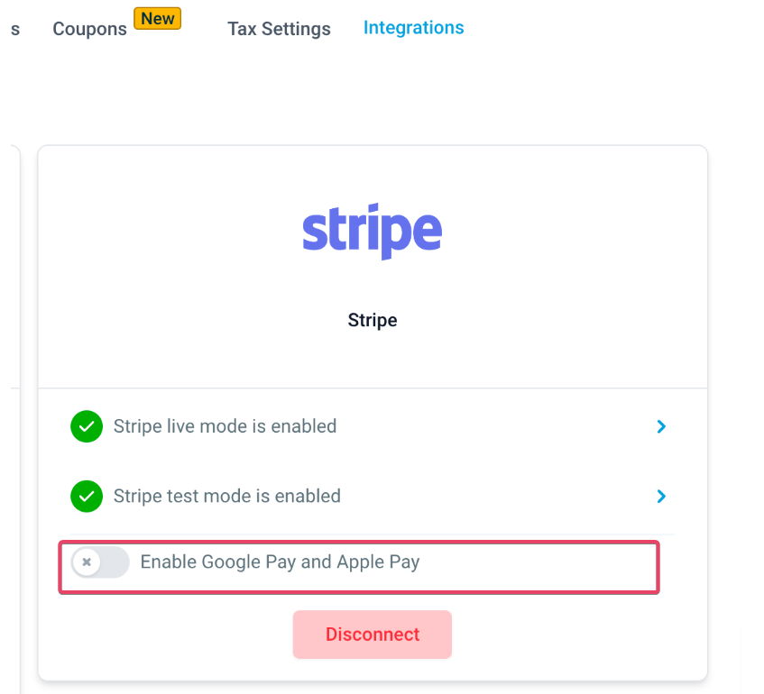 Using Stripe Connect under the Payments ➝ Integrations page is the primary requirement. If you're using Stripe APIs to connect to Stripe, please use Stripe Connect to use this feature. Once you have connected your Stripe account in Payments> Integrations, a toggle is provided to enable Apple Pay and Google Pay on the order forms.