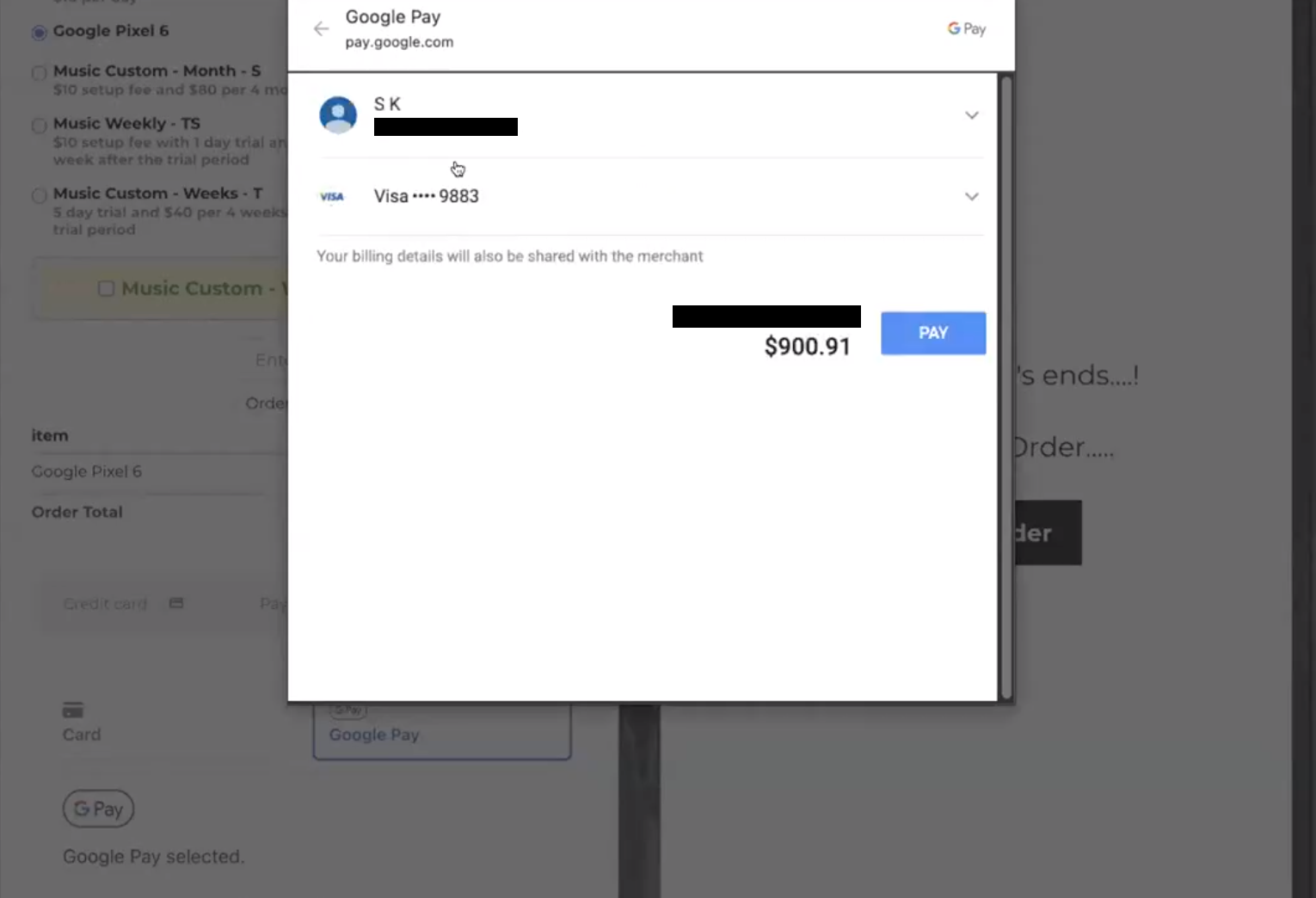 A view of what appears when a client clicks on Google Pay in an Order Form.