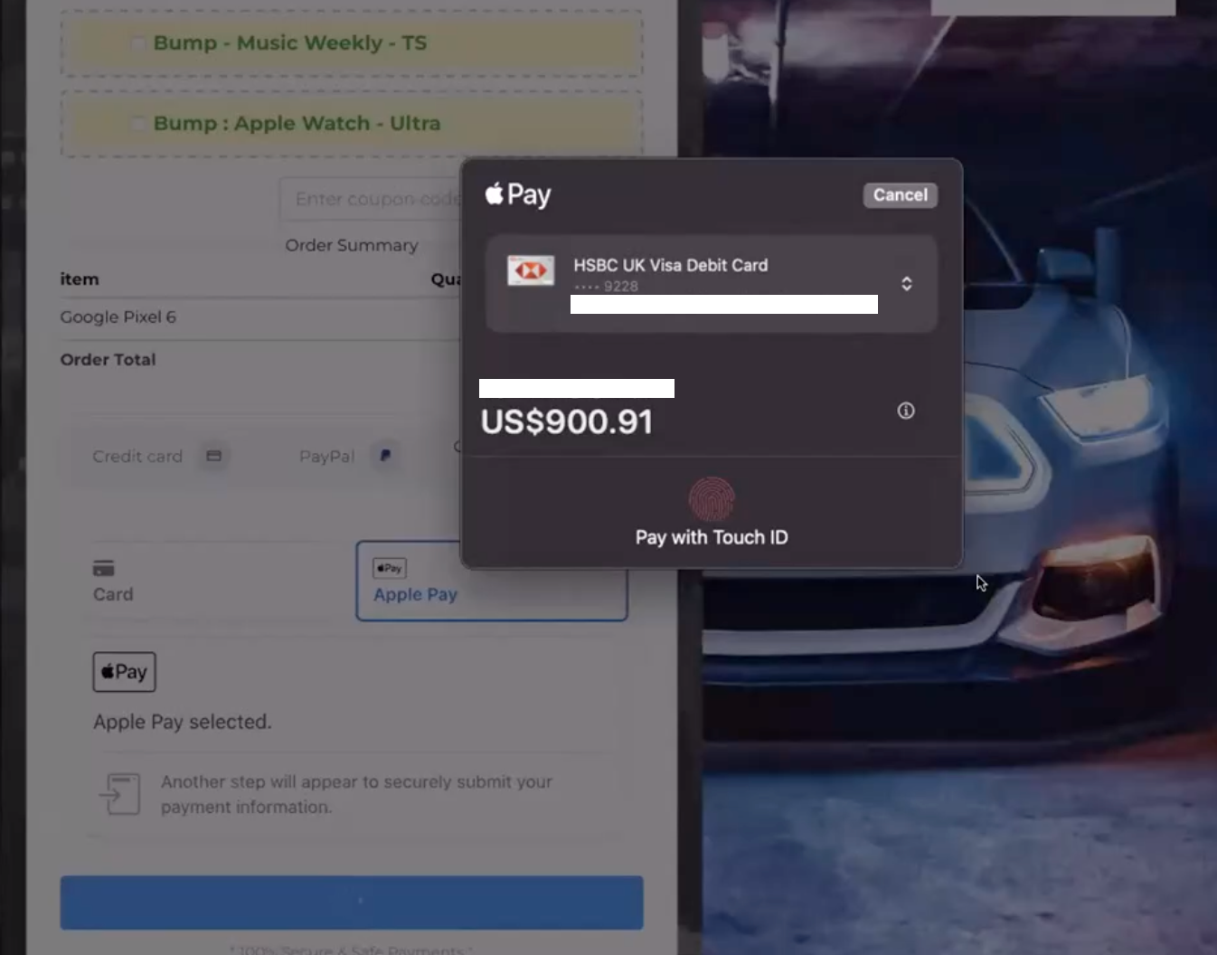 A view of what appears when a client clicks on Apple Pay in an Order Form.