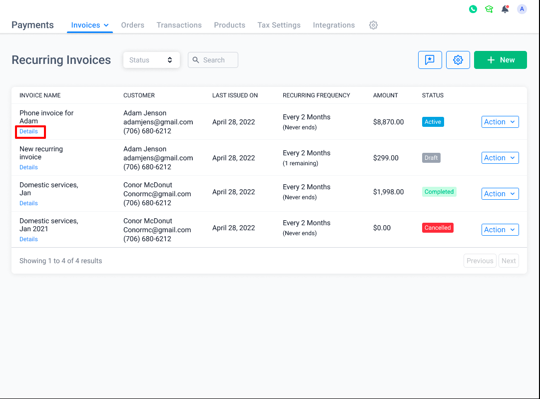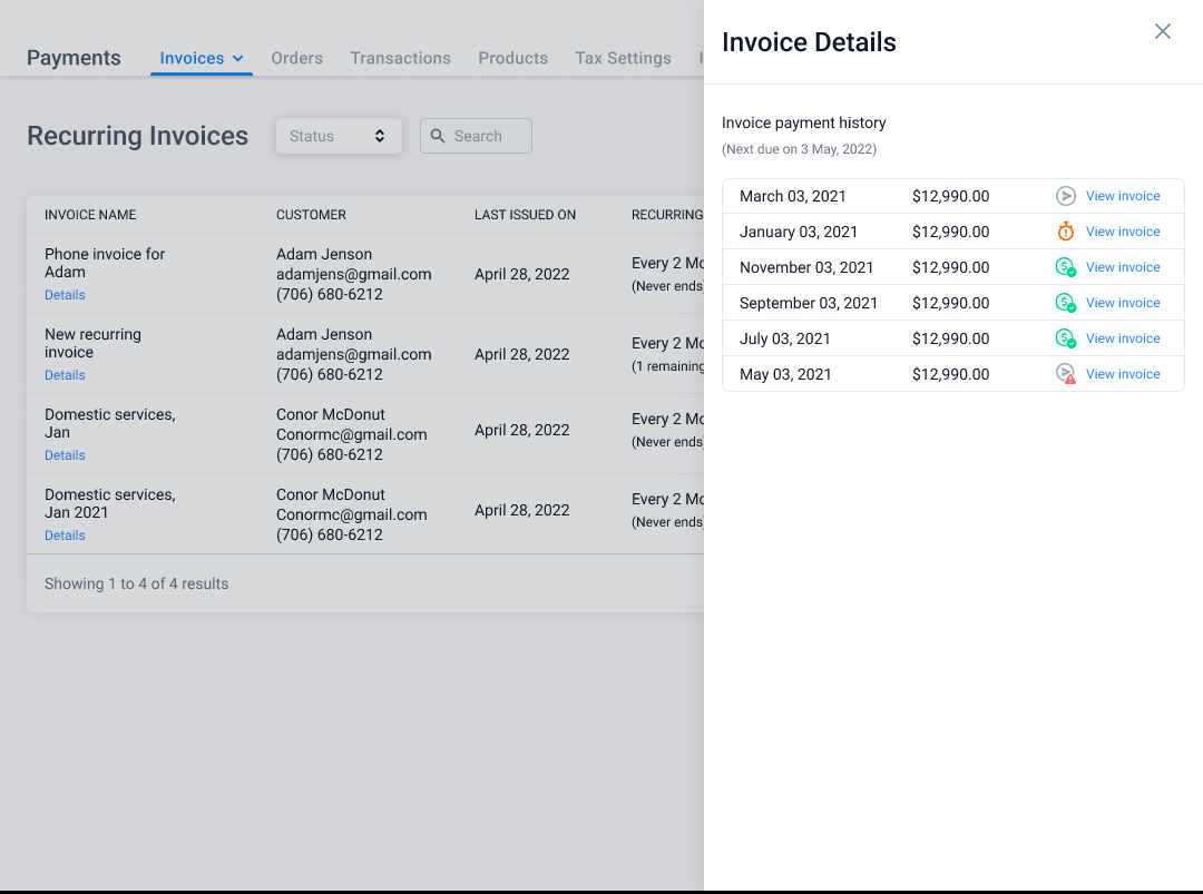 For simplicity, the list shows the parent invoice creator, which creates and sends out invoices per the frequency settings and customer details specified inside them. sends