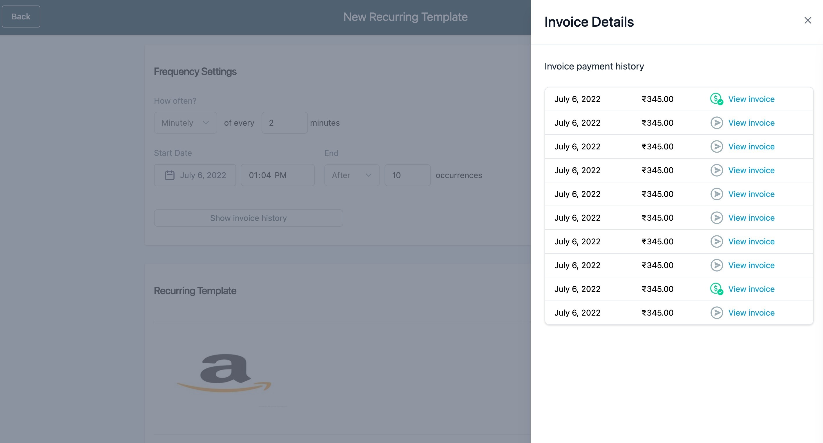 The invoice statuses can also be checked inside the invoice builder once the recurring template is Scheduled, which will open the right panel similarly.