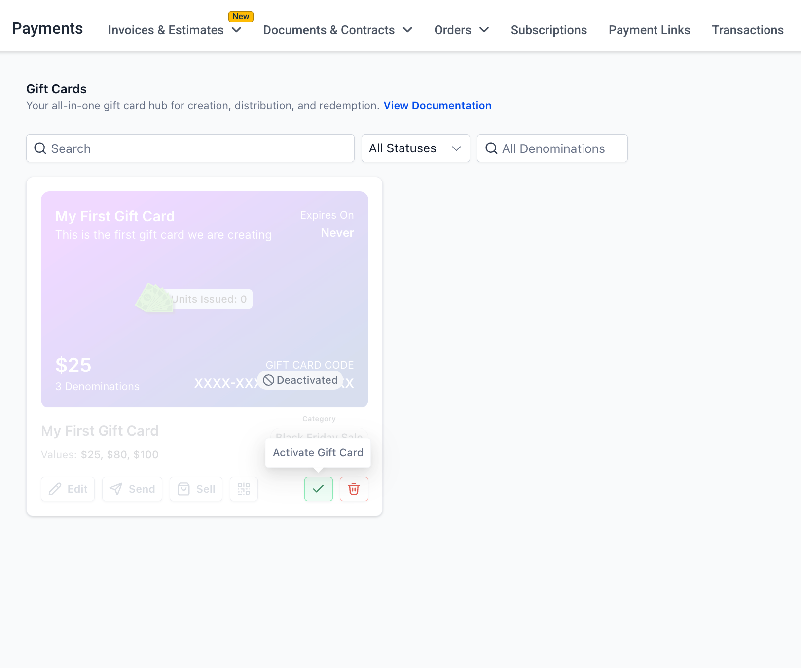 Track every issued card from the Gift Card Orders page with status, balance, and details.