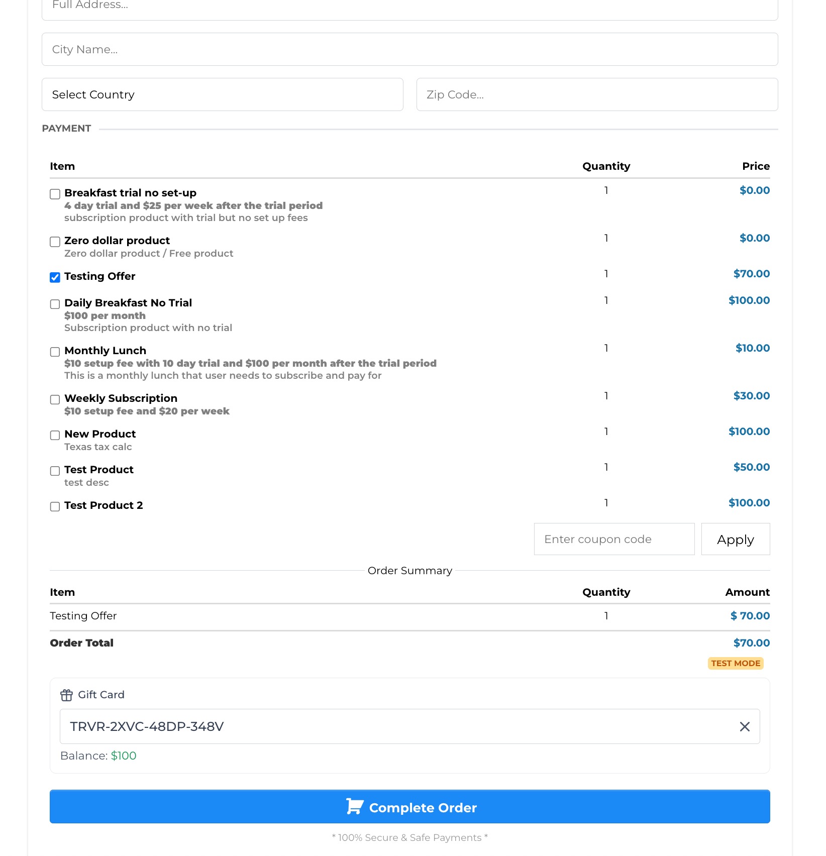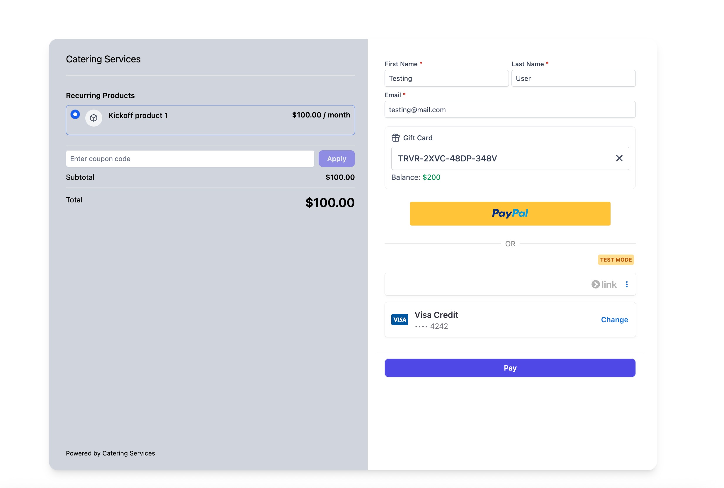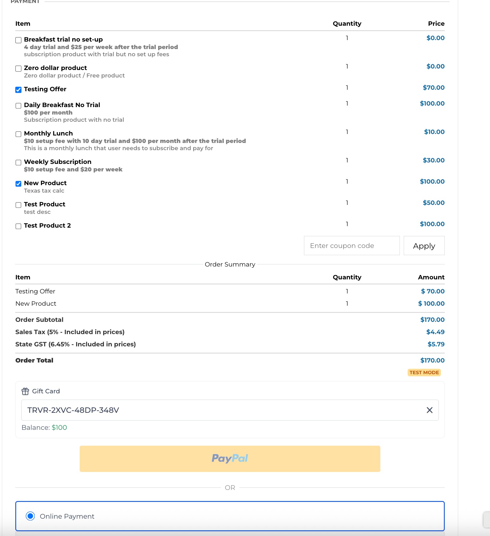 Gift Card redemption is fully supported with Stripe, NMI, Authorize and Square. However, There is limited support for gift card redemption for providers like PayPal, Adyen and custom payment providers. In case of the latter, gift cards can be redeemed on the checkout if the gift card balance fully covers the order/invoice total and the order/invoice does not contain any recurring or subscription product. If gift card cannot cover the full total or if the total has a recurring product, customer cannot redeem the gift card for the purchase.