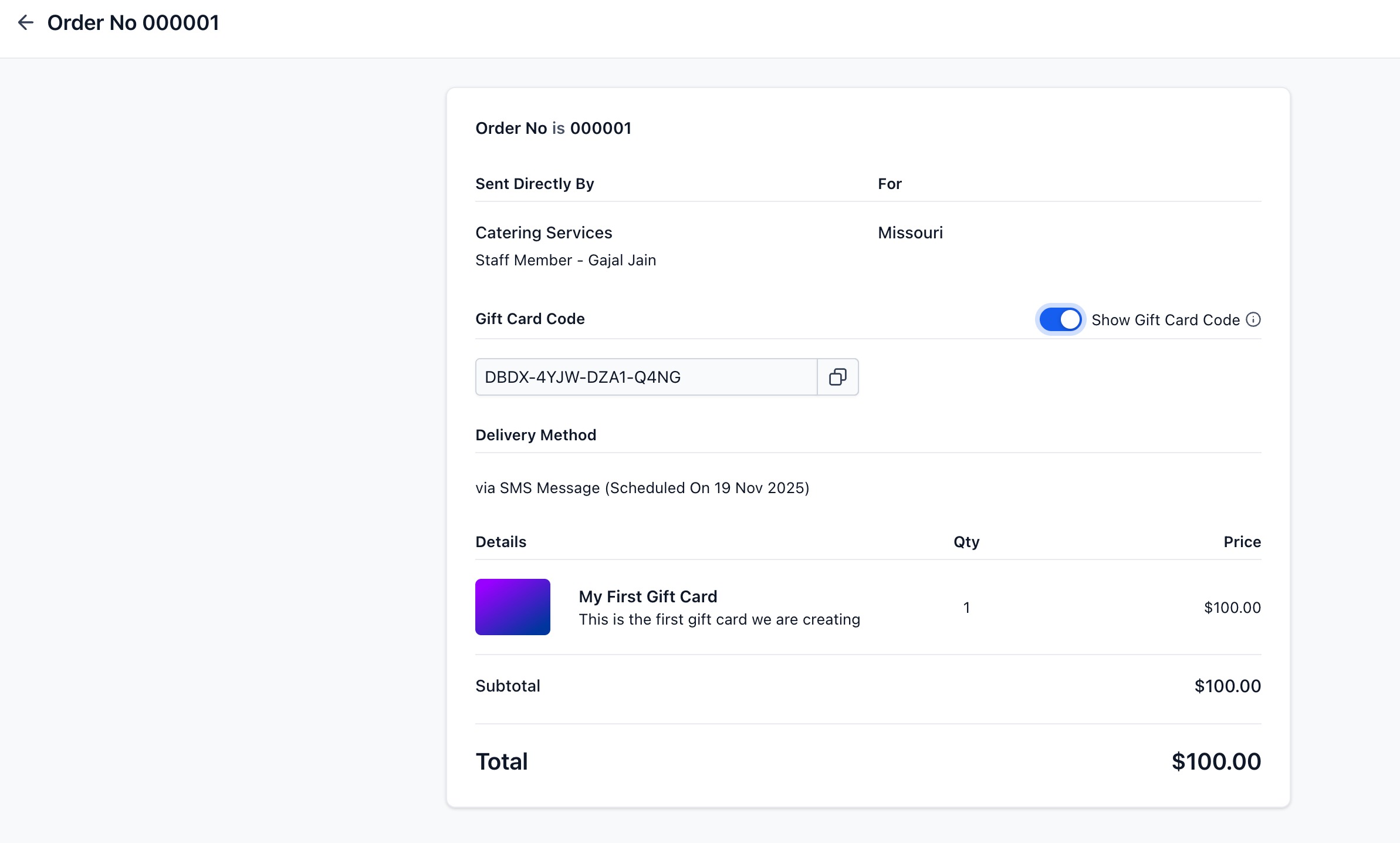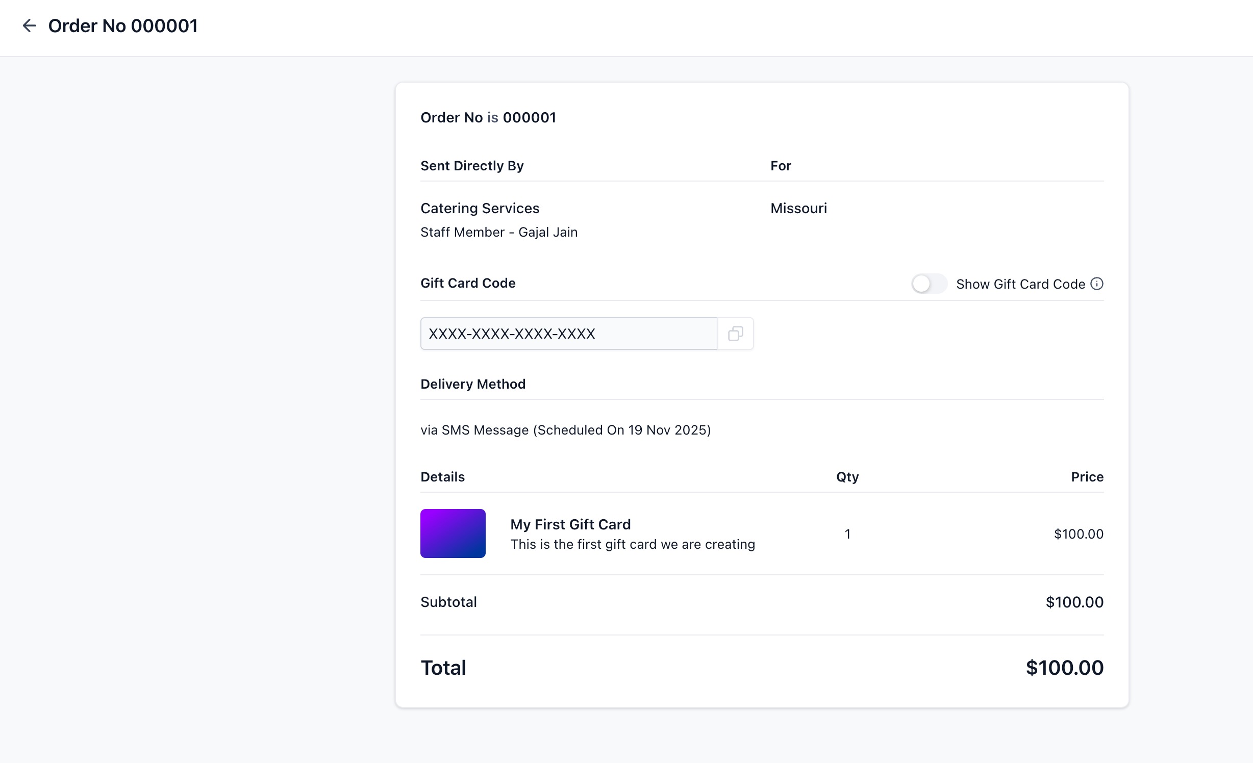 The gift card order details page acts as the single source of truth for all Gift Cards in the account. For each Gift Card Order, businesses can view: