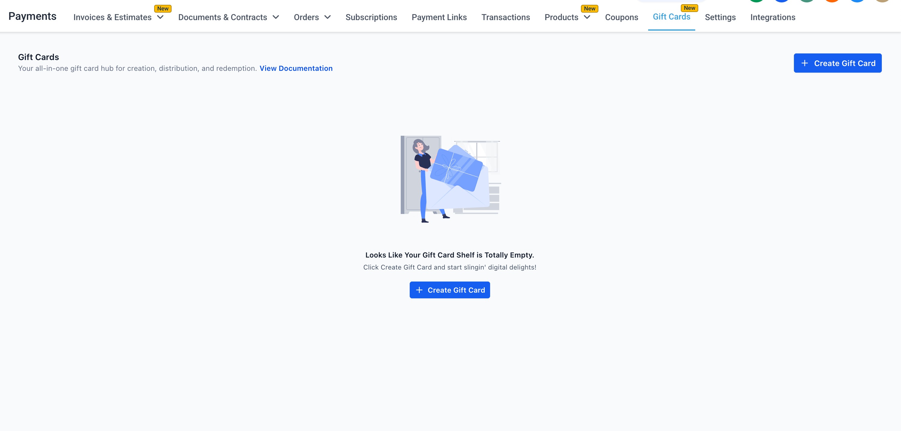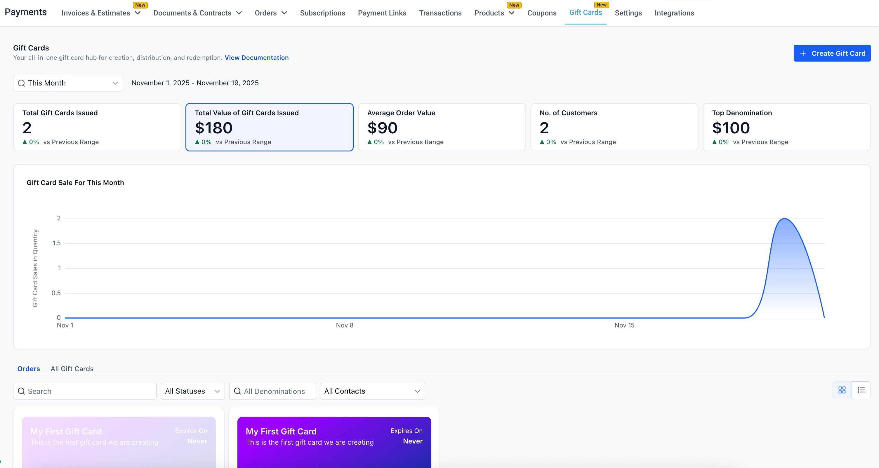 Gift Cards give your business a powerful way to drive sales, reward loyal customers and simplify promotions. With this feature you can create branded Gift Card Products, sell or send them, and track every issued card in a dedicated Gift Card Orders page — all from inside your Payments section.