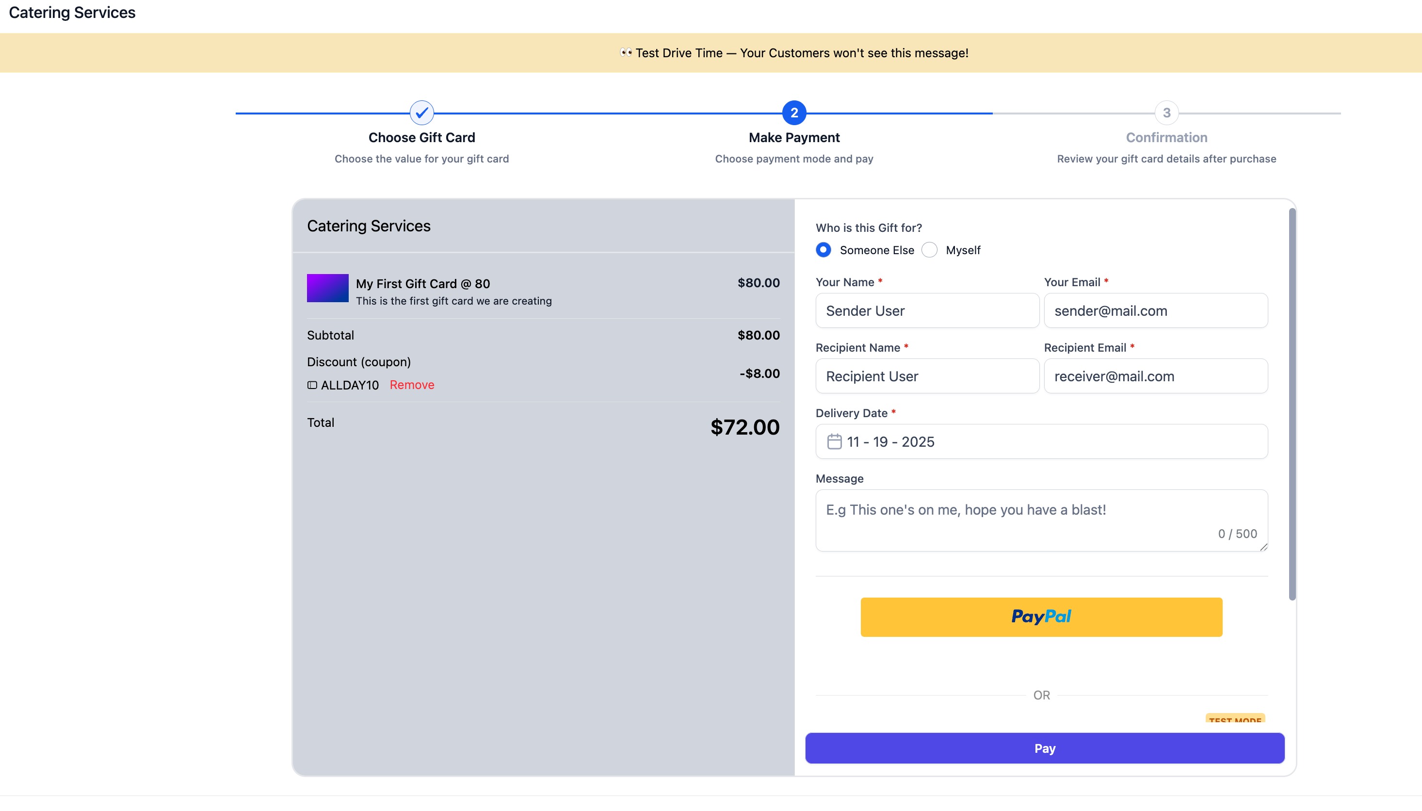Chooses “Buy for Someone Else” (collects purchaser + recipient details; receipt goes to purchaser, Gift Card to recipient) or “Buy for Yourself” (only purchaser details).