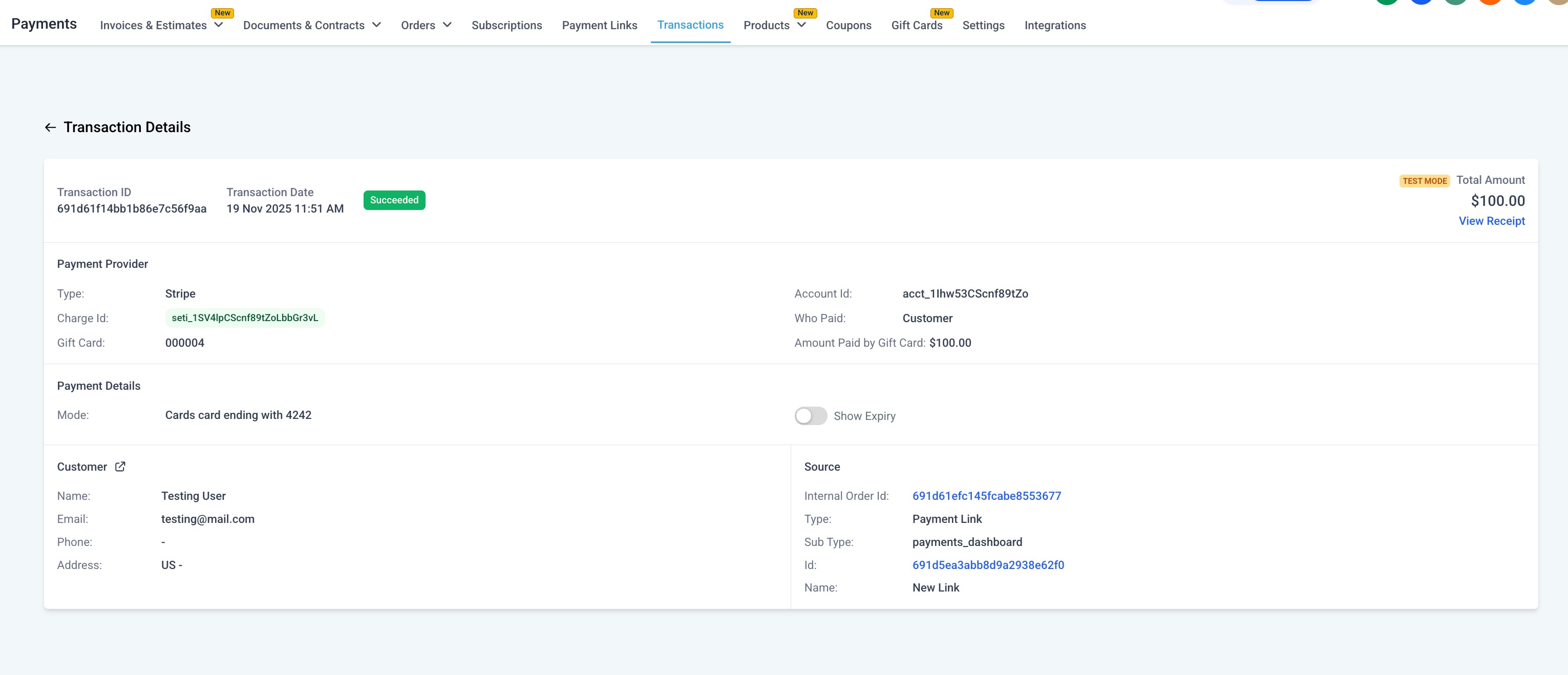 Result: A free Gift Card is issued to the contact — ideal for loyalty, refunds, or special campaigns. This will appear in Gift Card Orders but not in the general Payments → Orders page (since no payment occurred).