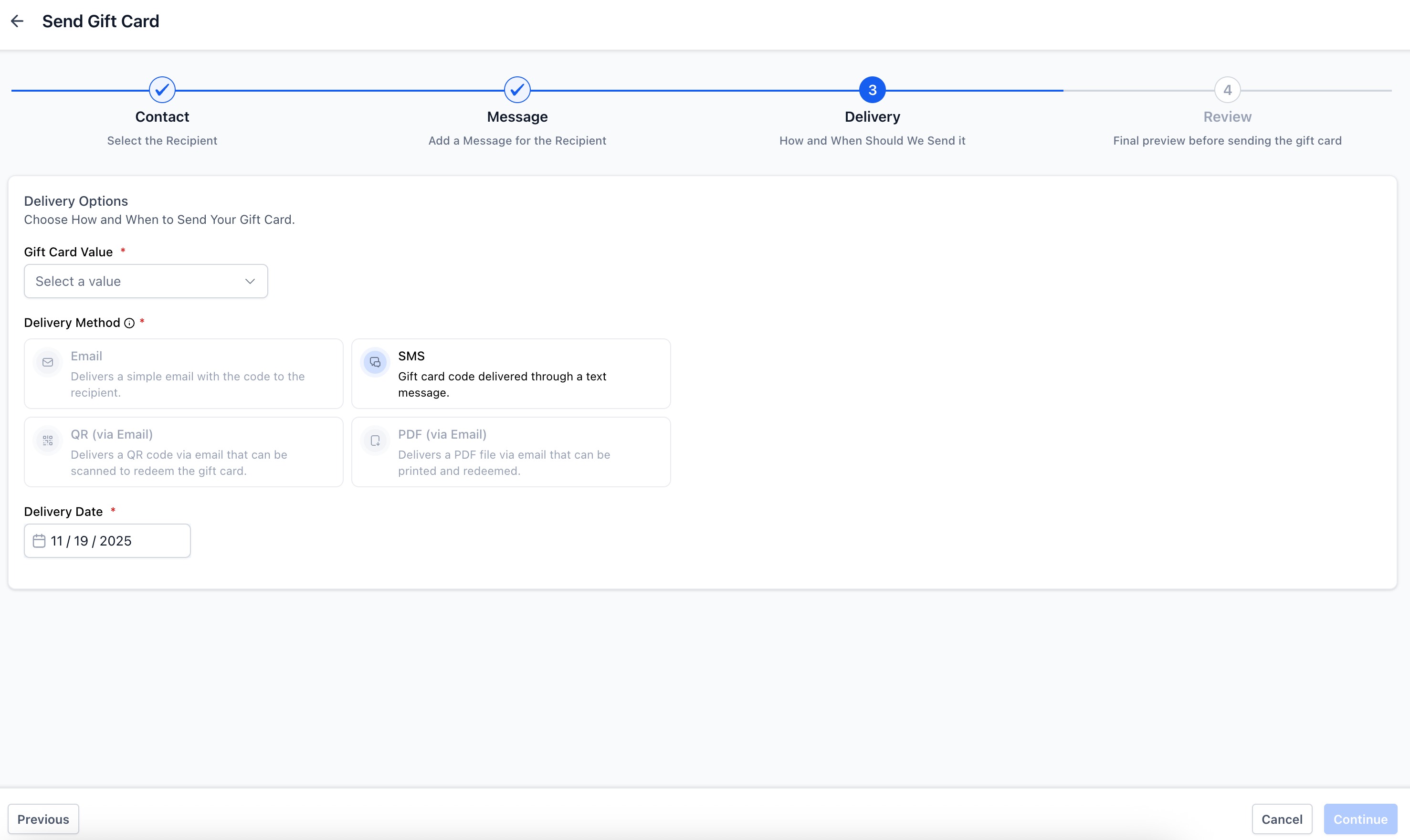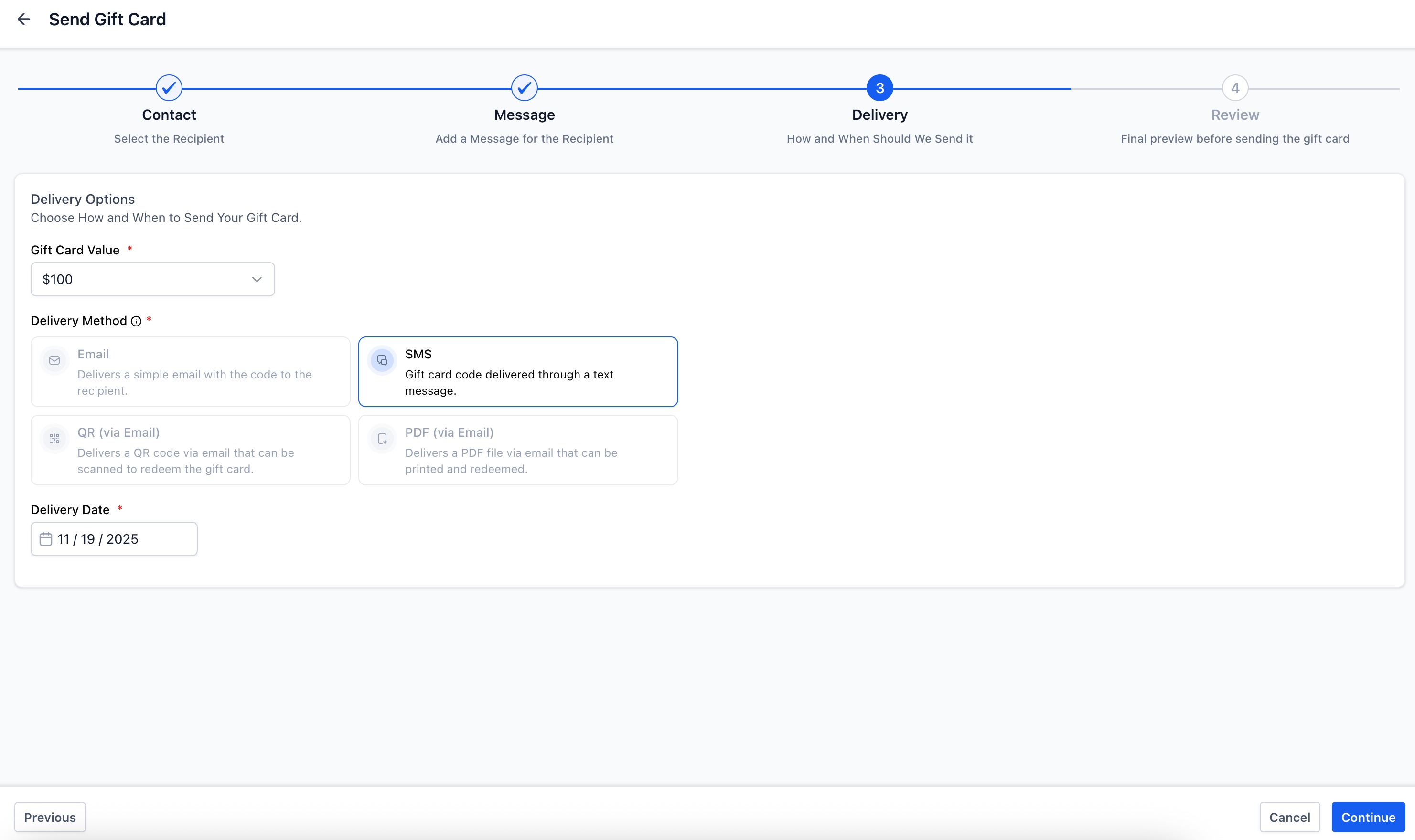 Choose the denomination and select delivery method: Email, SMS, QR via Email, or PDF via Email.