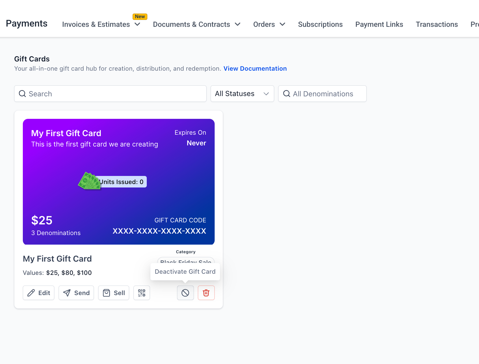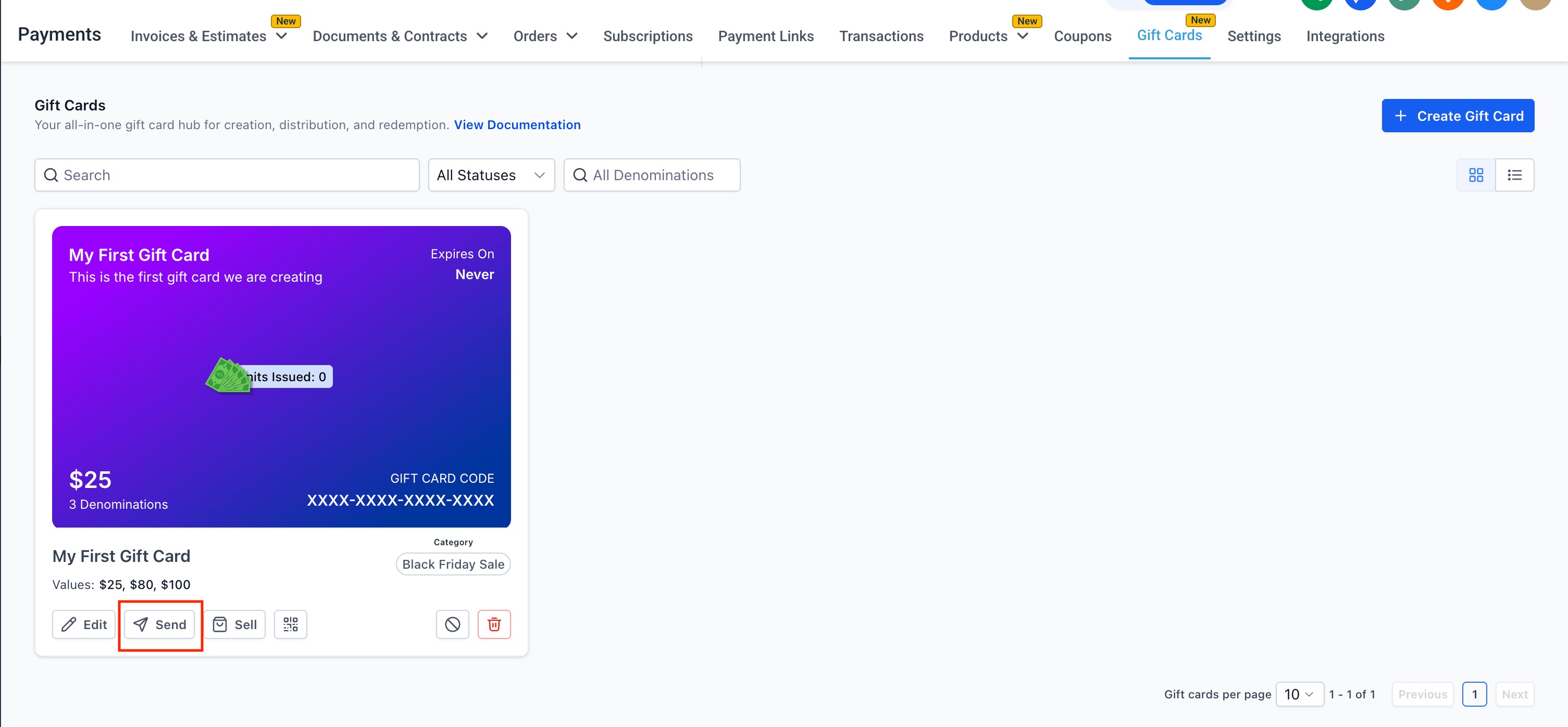 - On Payments → Gift Cards → Gift Card Products, view the card for any product you want to 'Send'