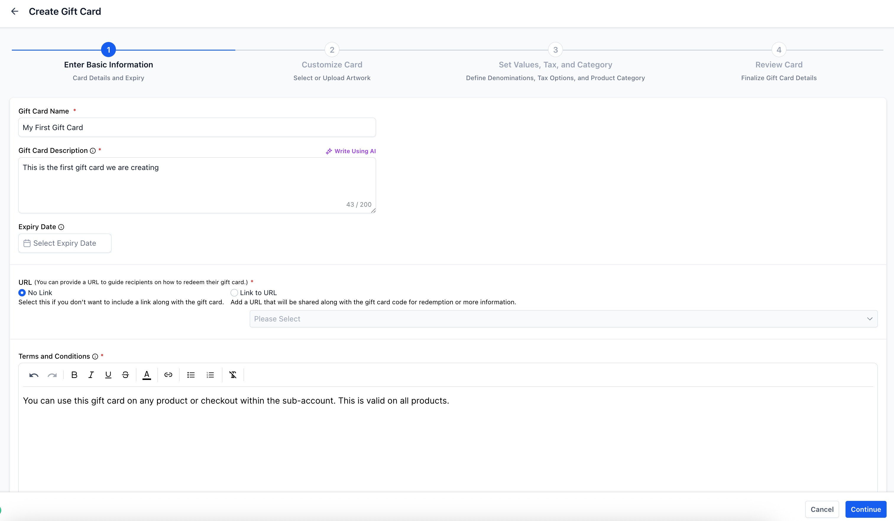 Create Gift Card Products with your branding, denominations, expiry dates and more.