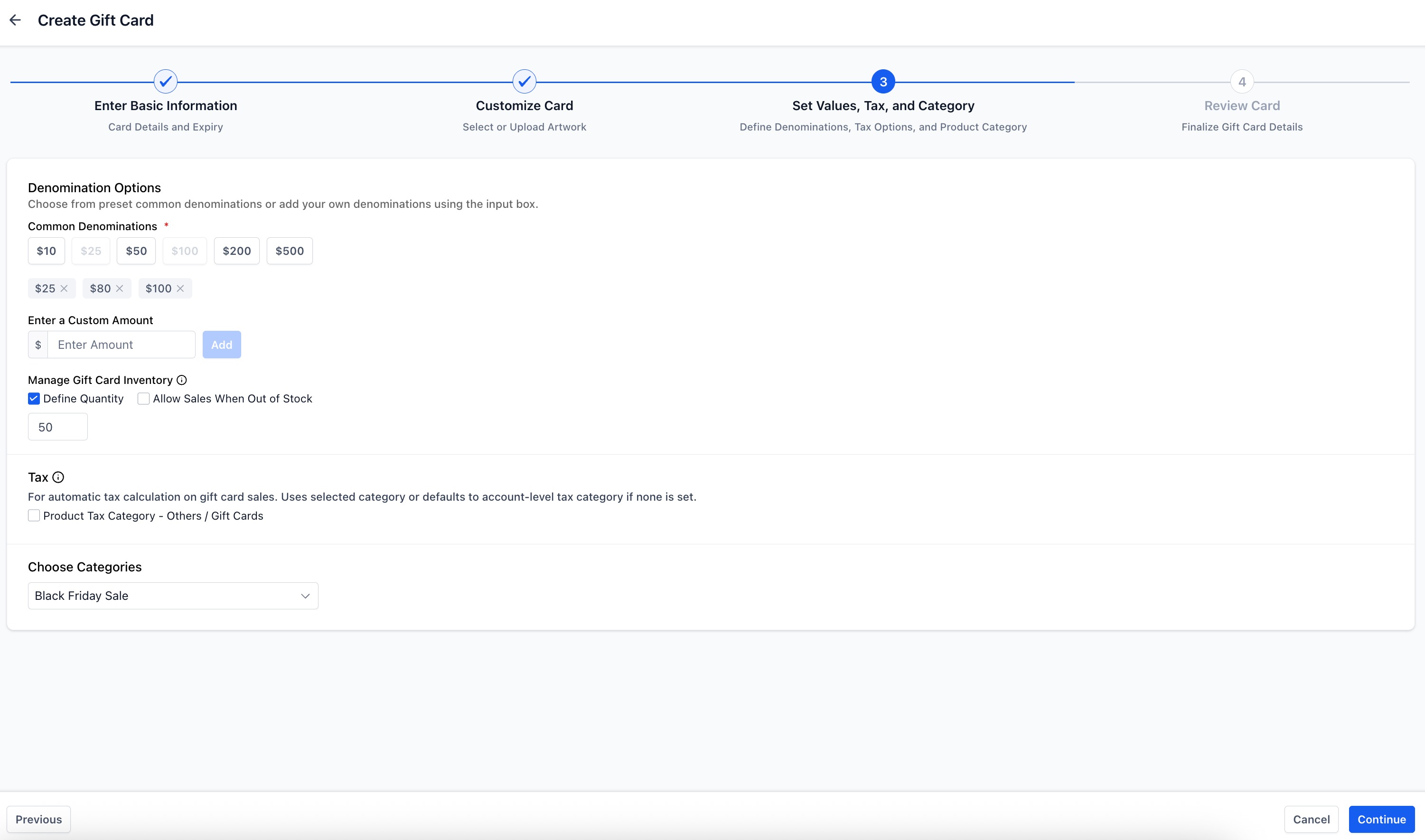 A: Inventory applies per denomination. For example, three denominations with inventory of 50 each = 150 total cards.