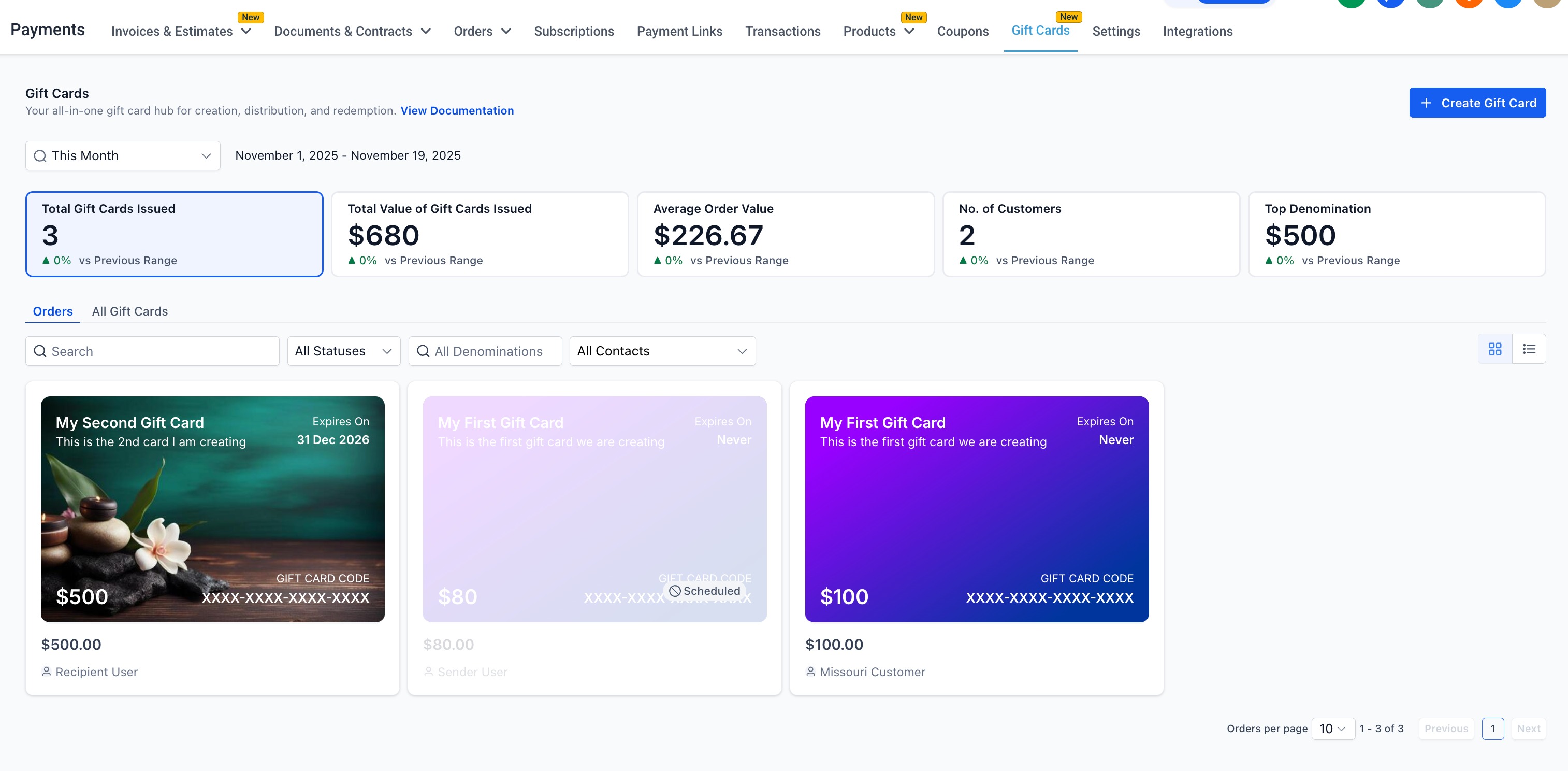 All issued Gift Cards (whether sold or sent) are listed under Payments → Gift Cards → Gift Card Orders.