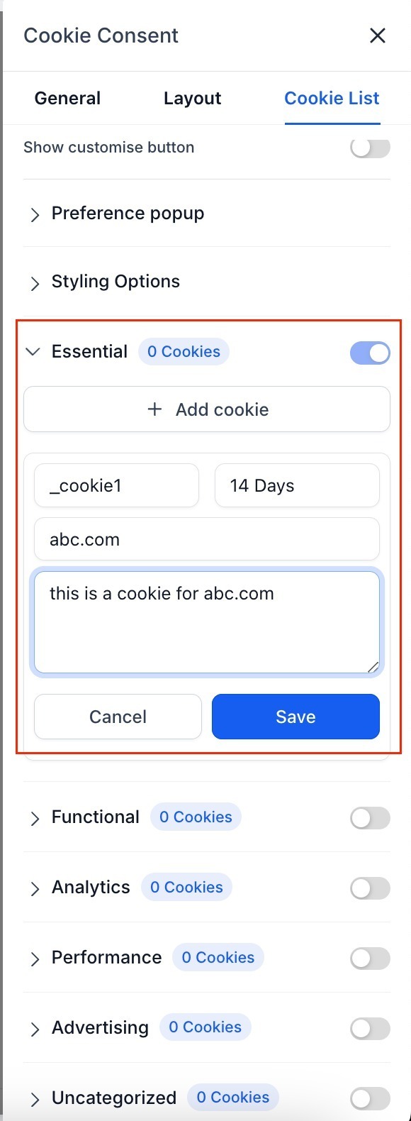 Predefined Cookie Categories