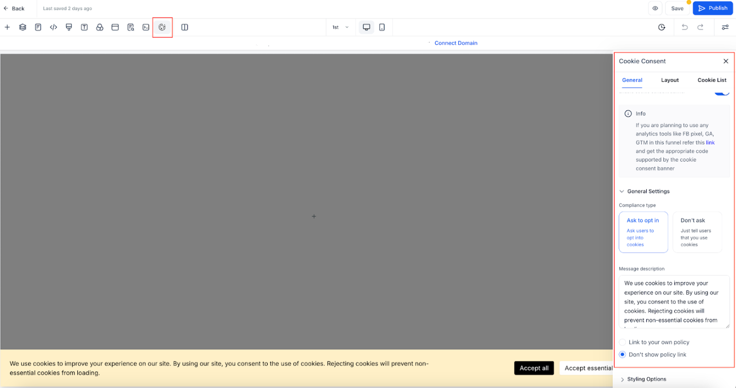 This guide will show you how to set up, customize, and manage the Cookie Consent Banner in Funnels & Websites. By following these steps, you can support your compliance program while providing visitors with control over their cookie preferences.