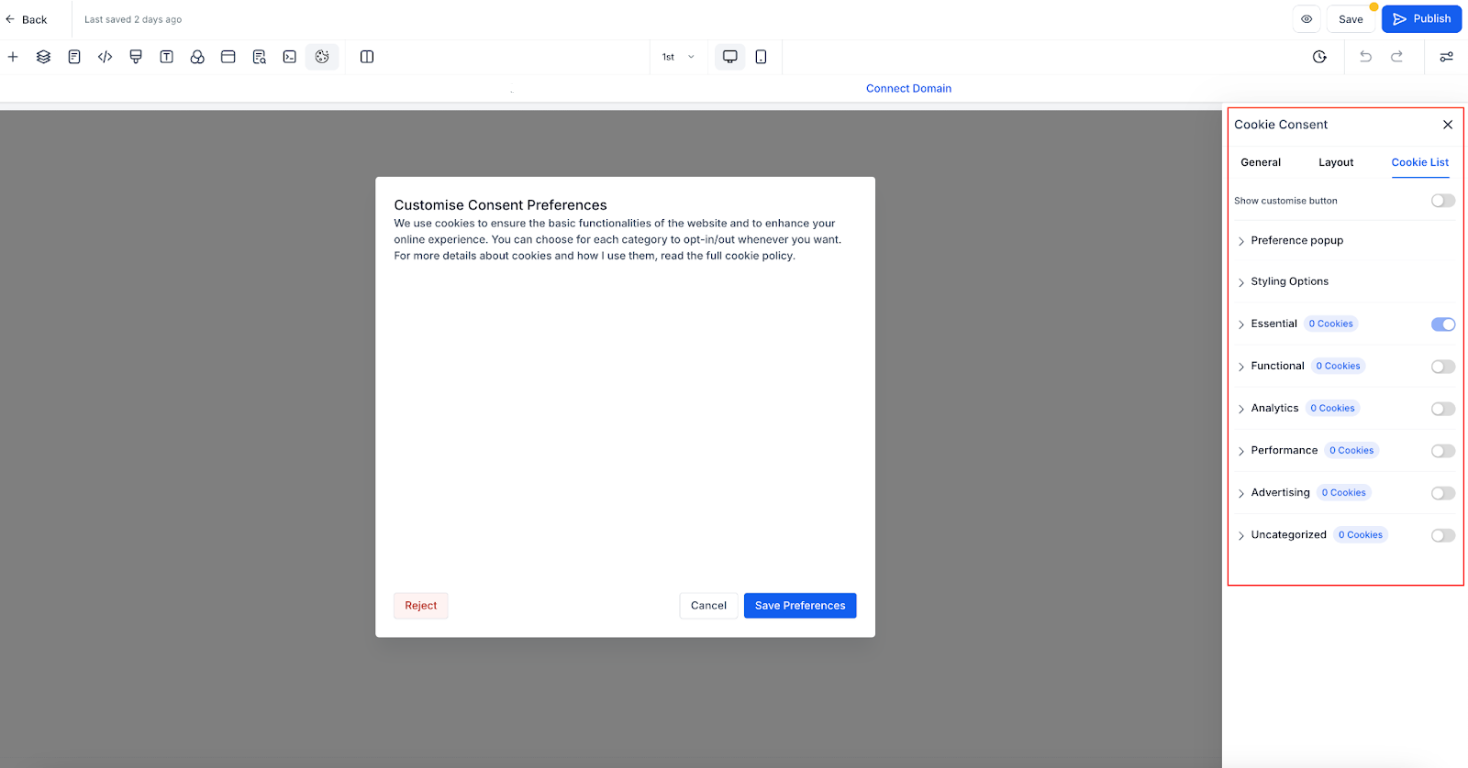 The Cookie List feature lets users enable or disable different types of cookies. When activated, visitors can select which cookies they want to allow.