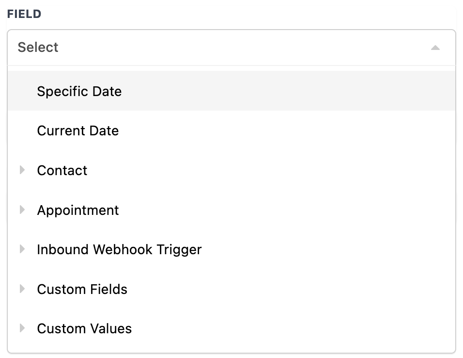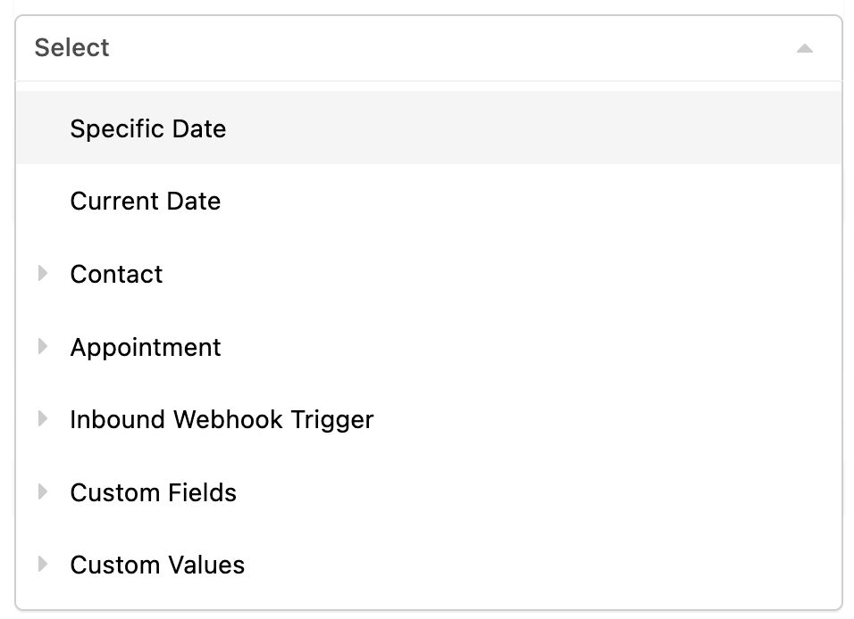 Choose the date field you want to reformat. You can select various sources such as a Specific Date, Current Date, Contact's date fields, date type custom fields, Appointment start/end date, Custom values, or even from an Inbound Webhook Trigger.