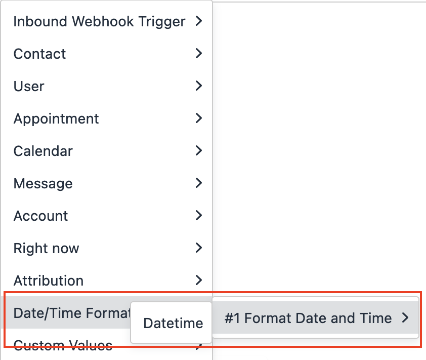 Choose the date and time field you want to reformat. You can select various sources such as a Specific Date and Time, Current Date and Time, Appointment start/end date and time, Custom values, or even from an Inbound Webhook Trigger. Note that Contact Custom fields do not currently support Date Time structures.