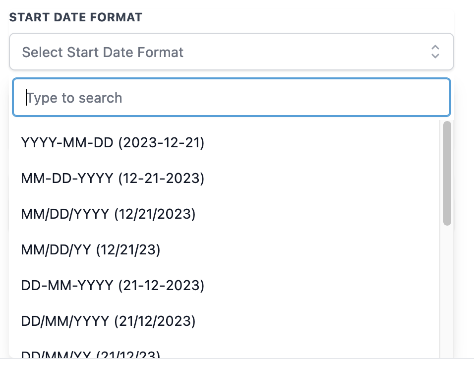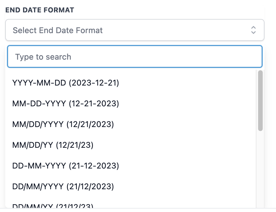 Like the start date format, the tool will auto-detect the format and preselect it if you choose a system field. You must manually select the matching format for Custom Value or Inbound Webhook Trigger.