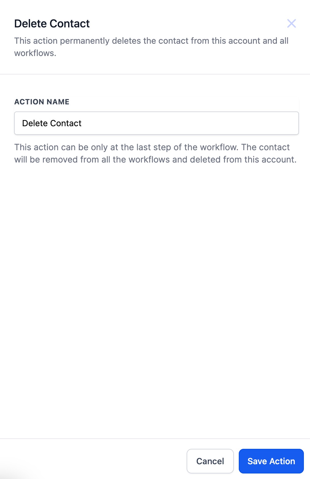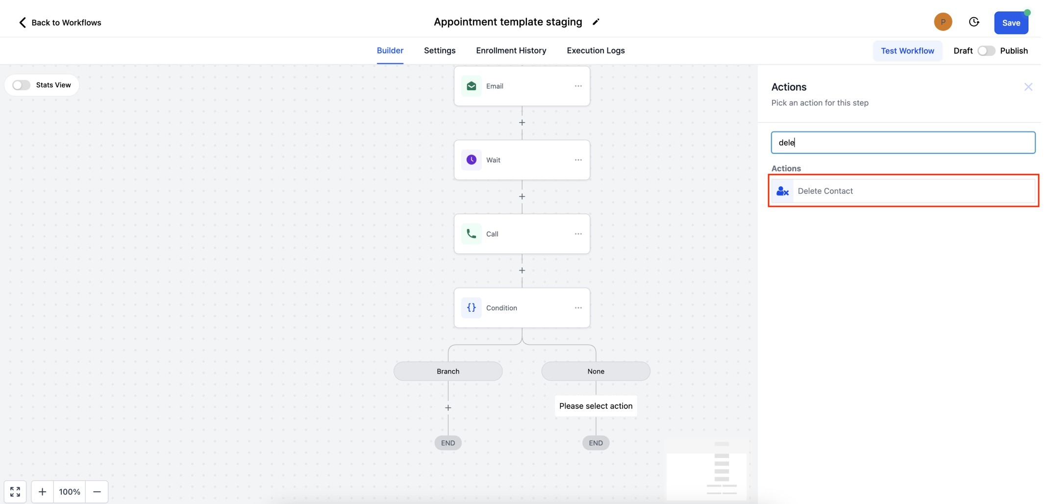 A: Delete Contact action can be available only as the last step of the workflow. This action can only be added to the end of the branch.