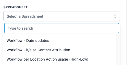 Once you have selected a Google Drive from the dropdown menu, all Spreadsheets associated with the integrated Google Drive will be displayed for you to choose from.