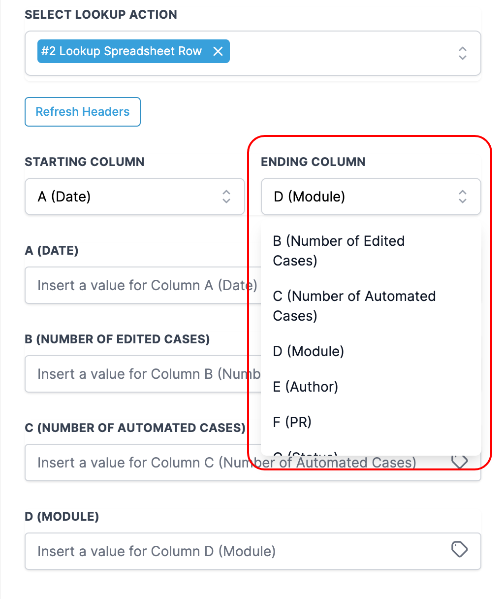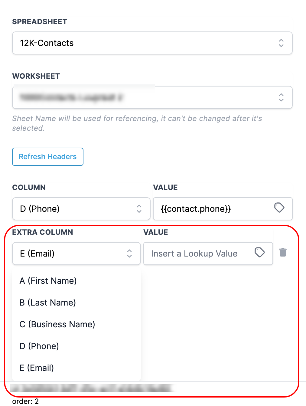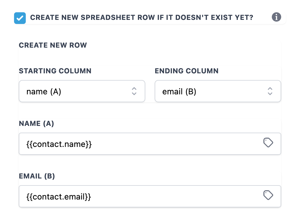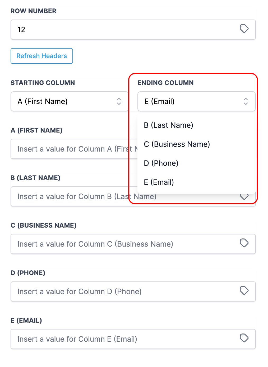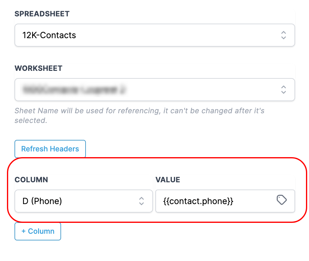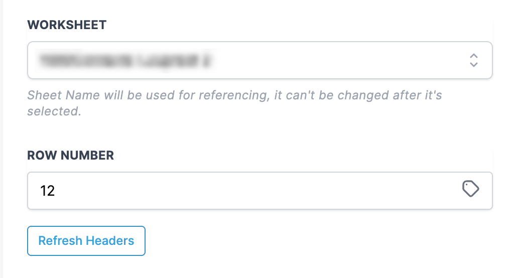 The first row is considered Headers, shown as labels for each Column. You can fetch the latest headers from the sheet by clicking "Refresh Headers".columncolumn