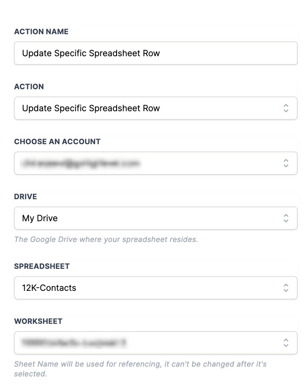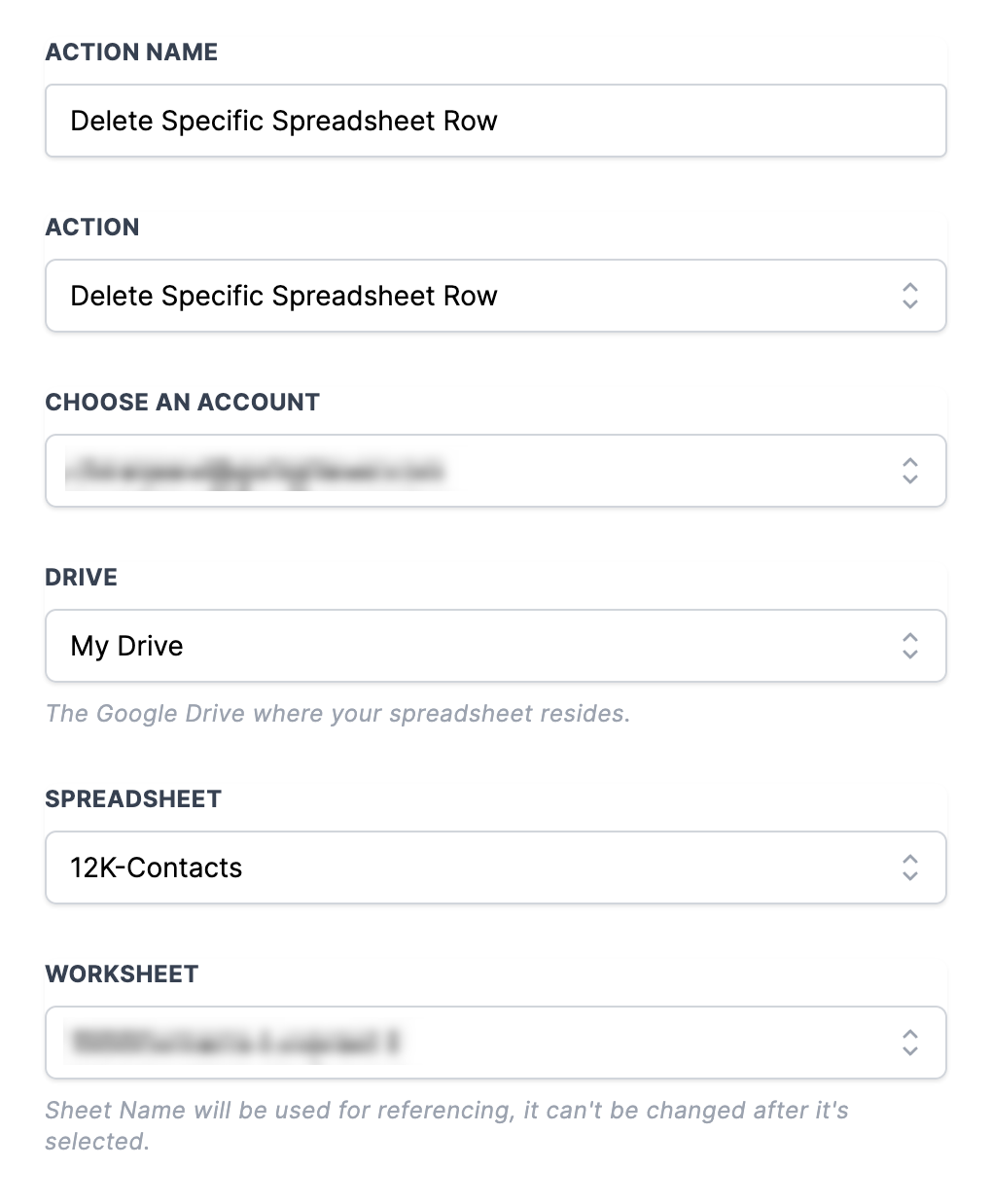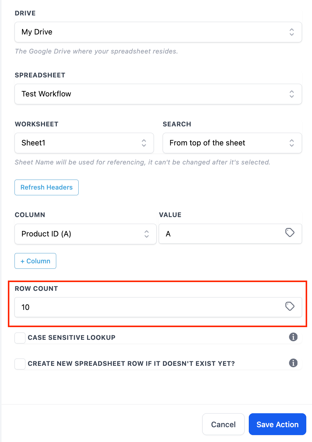 - Referencing the Google Sheets Lookup Action cannot find a matching row; all subsequent Google Sheets Actions that reference this Lookup Action will be skipped due to lack of a result. Therefore, consider this when building workflows that include this Lookup Action and the Google Sheets: Update Spreadsheet Row using Lookup or Google Sheets: Delete Spreadsheet Row using Lookup.