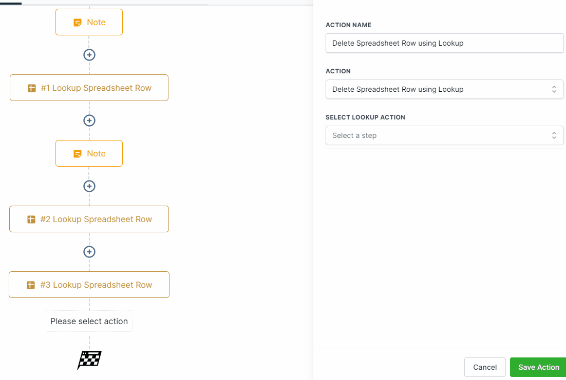 If you want to use the "Delete using lookup" action, it is necessary to first use the "Lookup" action to search for a specific row in your spreadsheet based on a particular value. Once you have found the desired row using lookup, you can then use the "Delete using lookup" action to clear the row data. Therefore, using the lookup action prior to delete using lookup is a necessary step in this process.Select Lookup Action