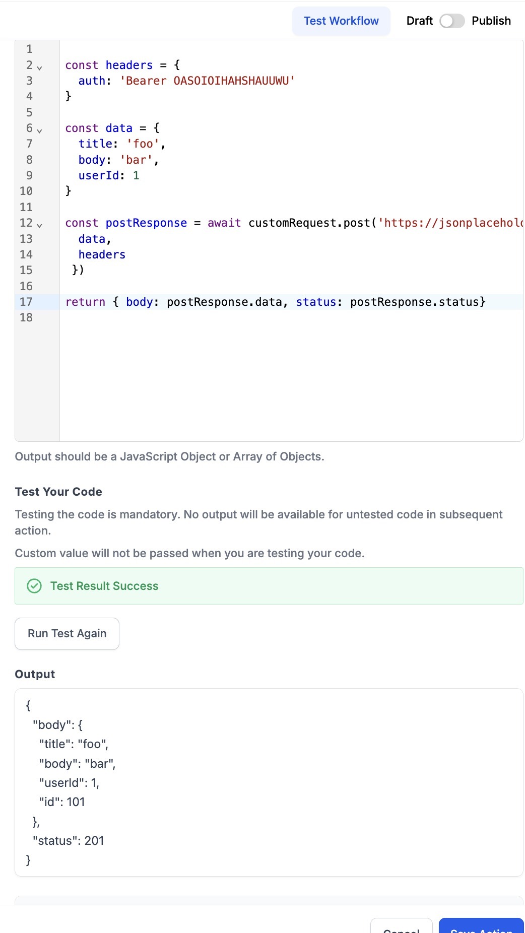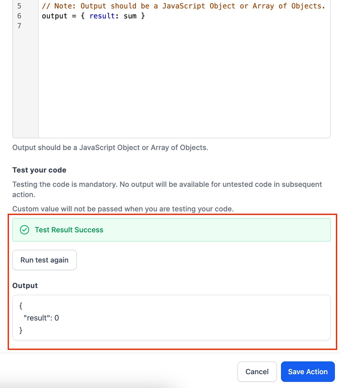 - Post clicking on Run test button, if there are no errors in the code them it will show "Test Result Success" and if there is an error in code then the result will be "Test Result Failed" and you would have to recheck the code to remove the error.