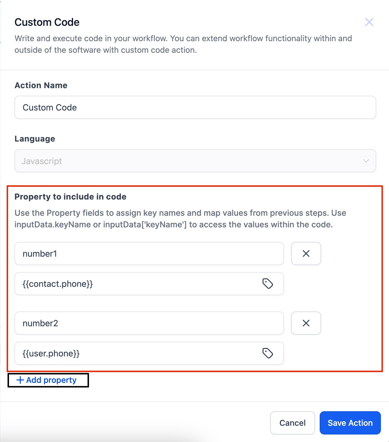 - Use the Property fields to assign key names and map values from previous steps. Use inputData.keyName or inputData['keyName'] to access the values within the code.