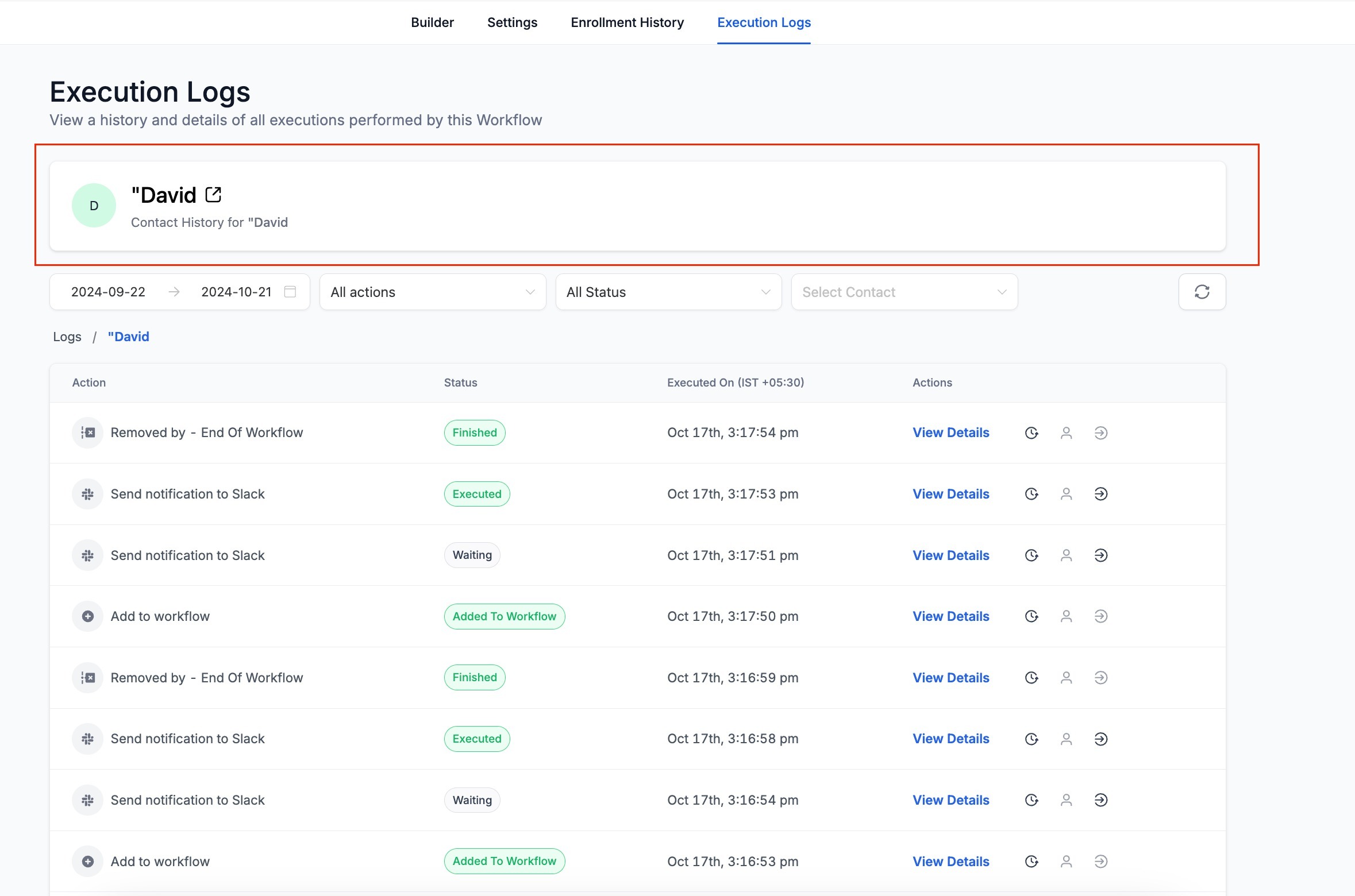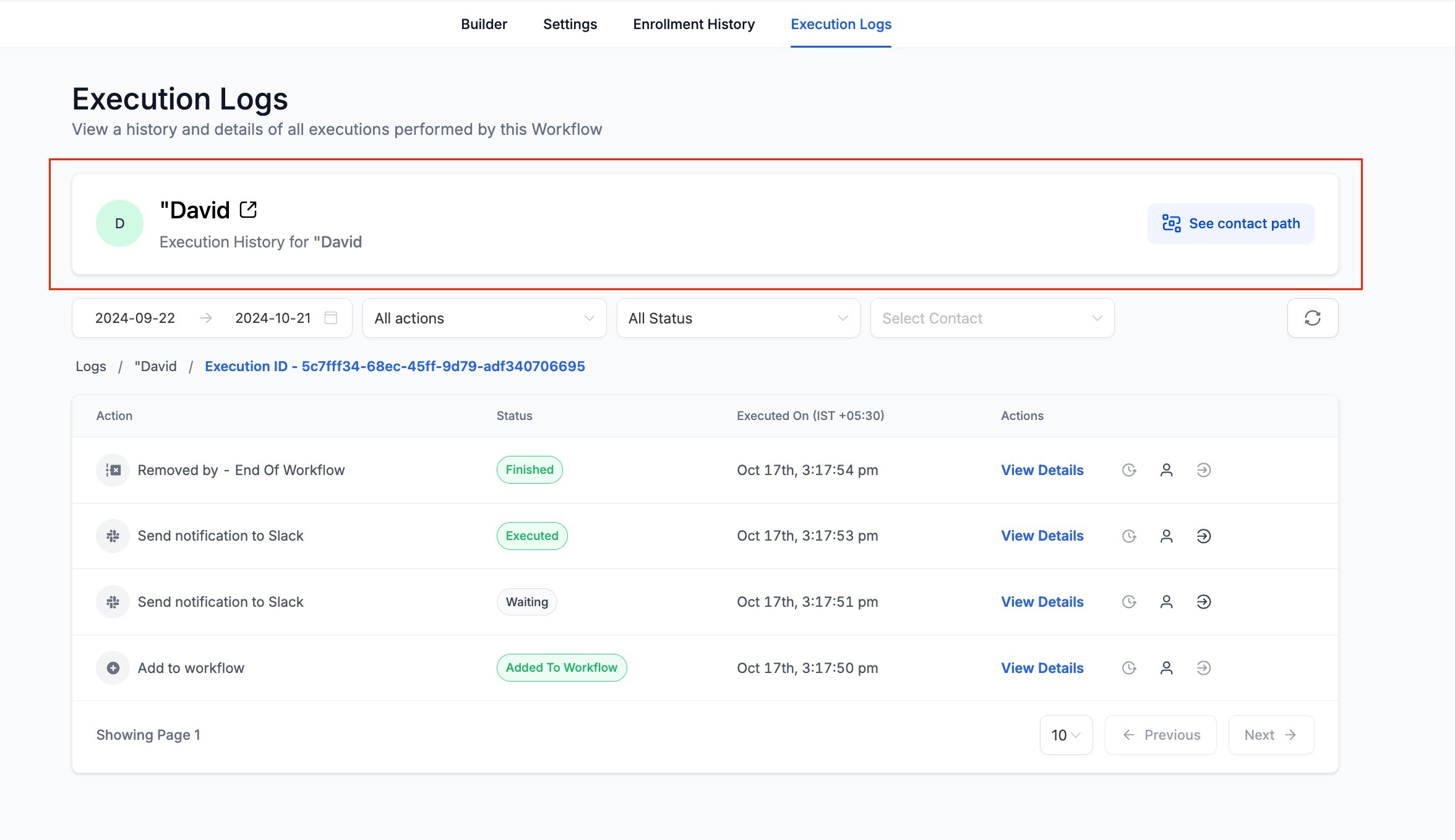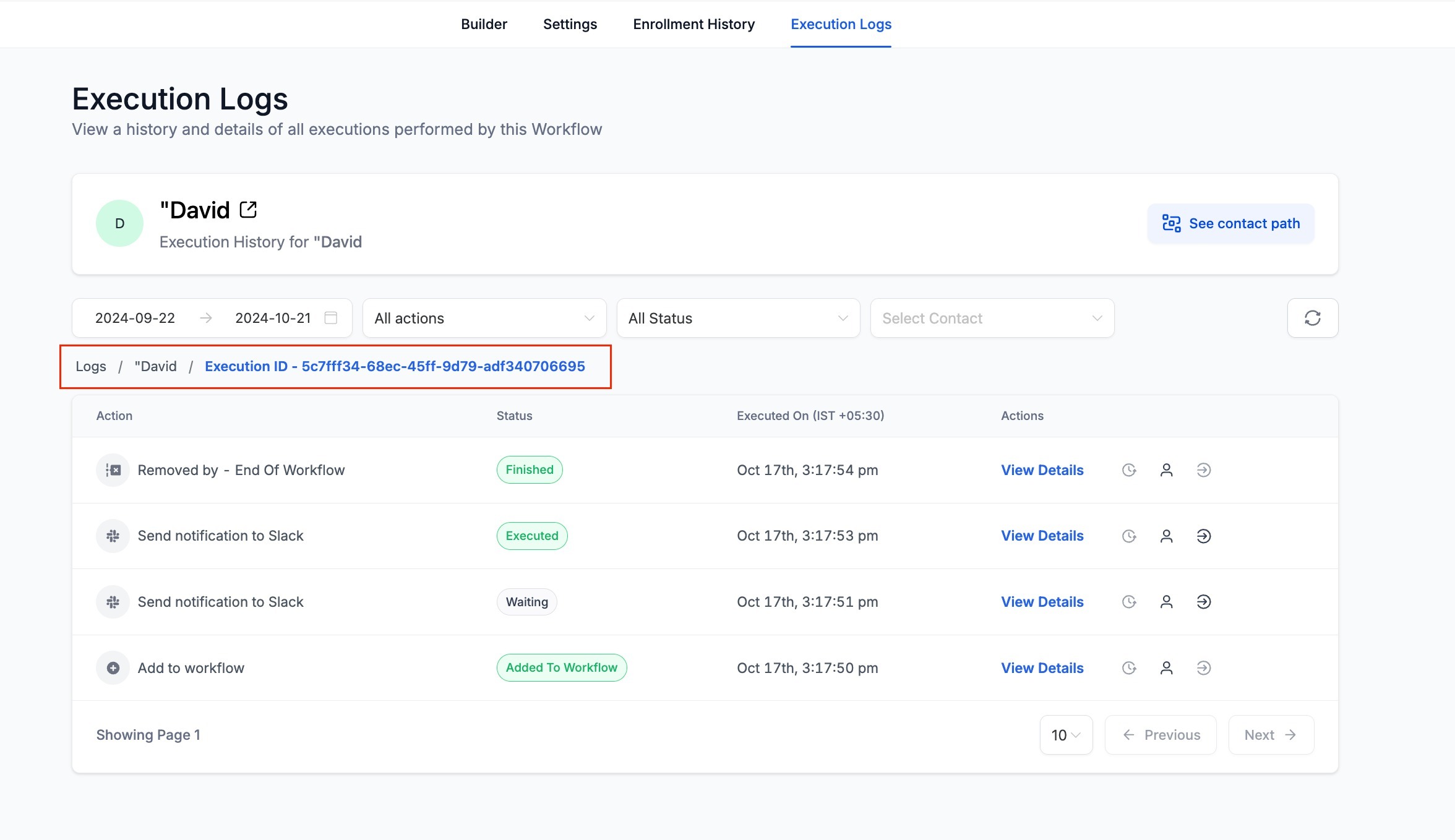 - On clicking the "View Execution History" icon in the Enrollment history or Execution logs. the execution history for that contact for a specific enrollment will open.