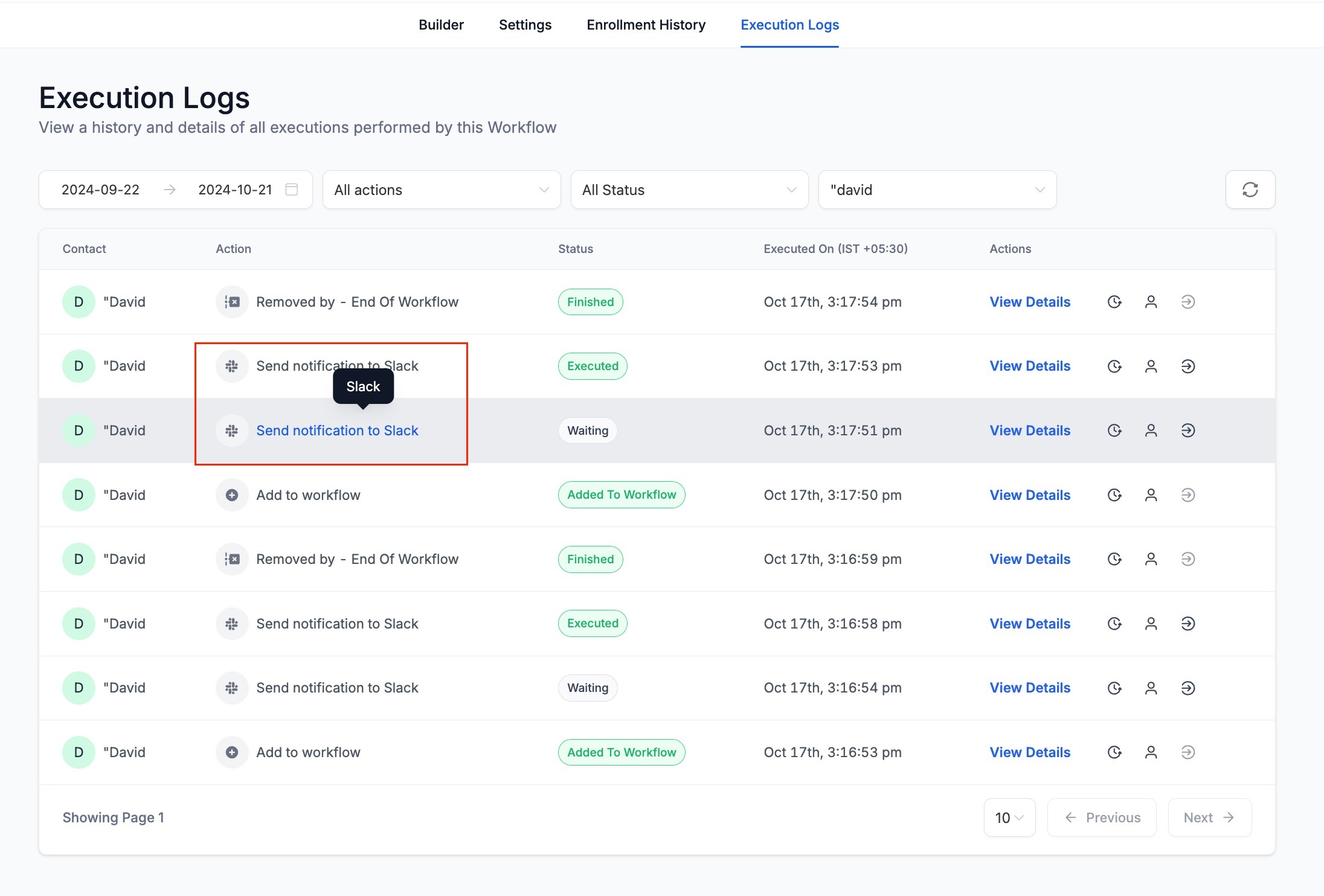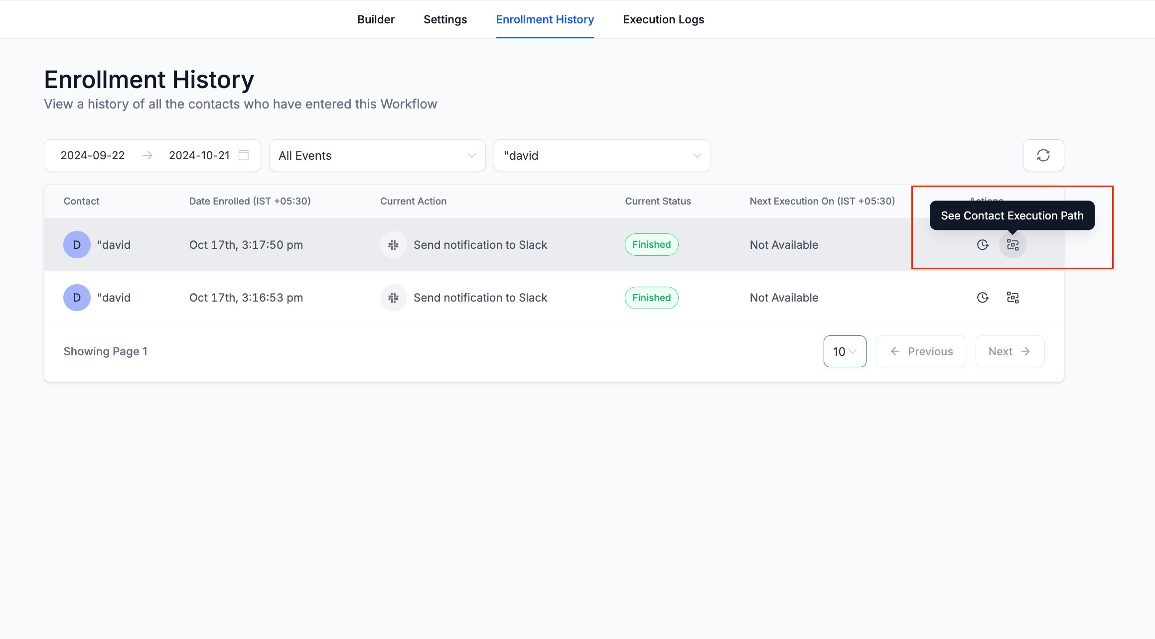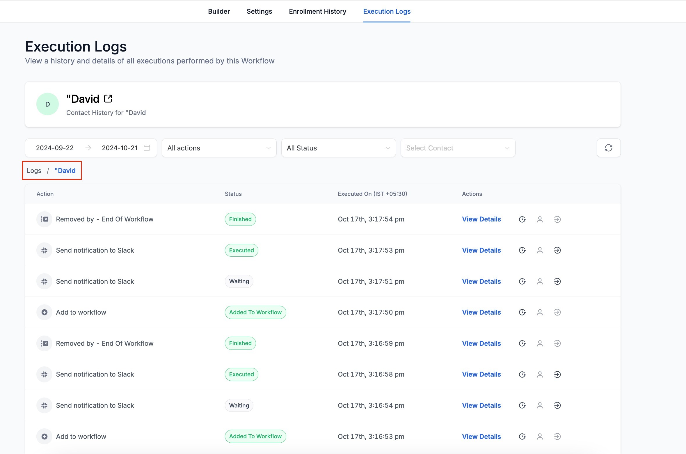 - On clicking the "View Execution History" icon in the Enrollment history or Execution logs. the execution history for that contact for a specific enrollment will open.