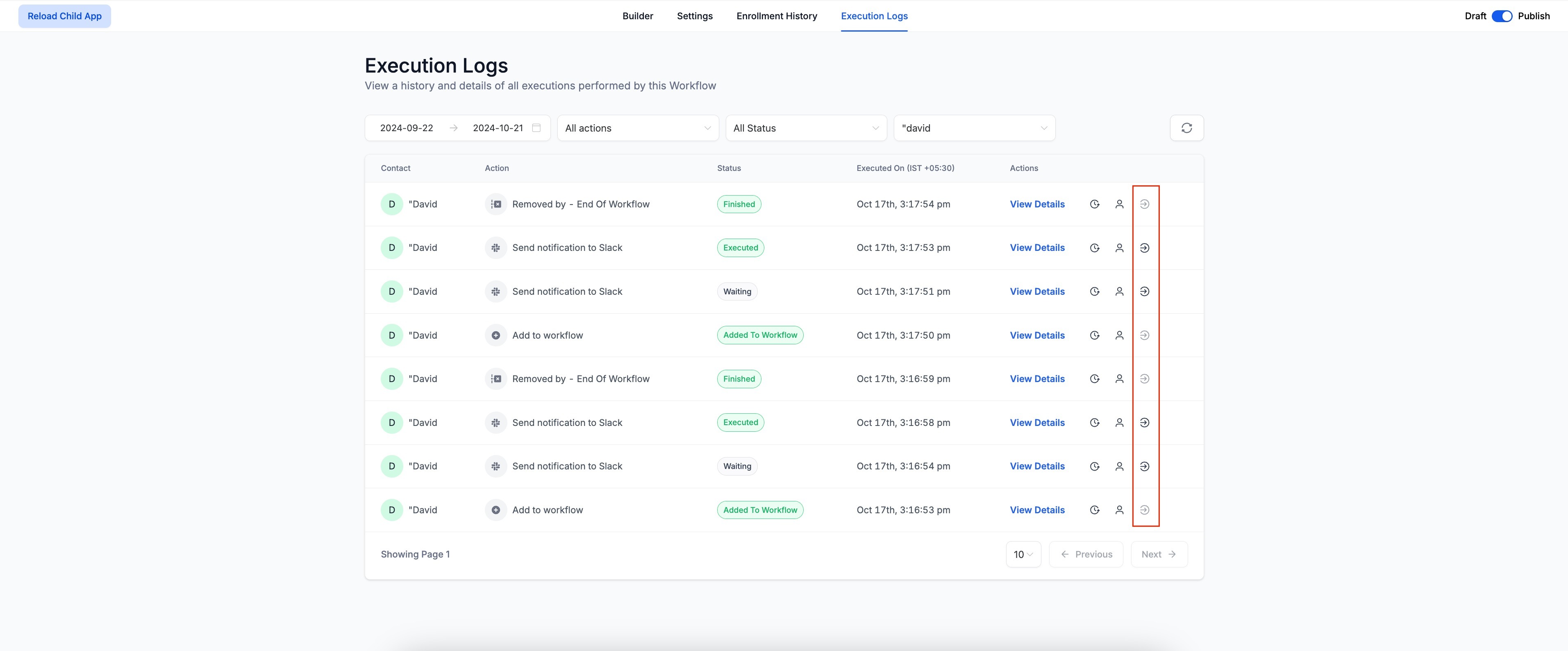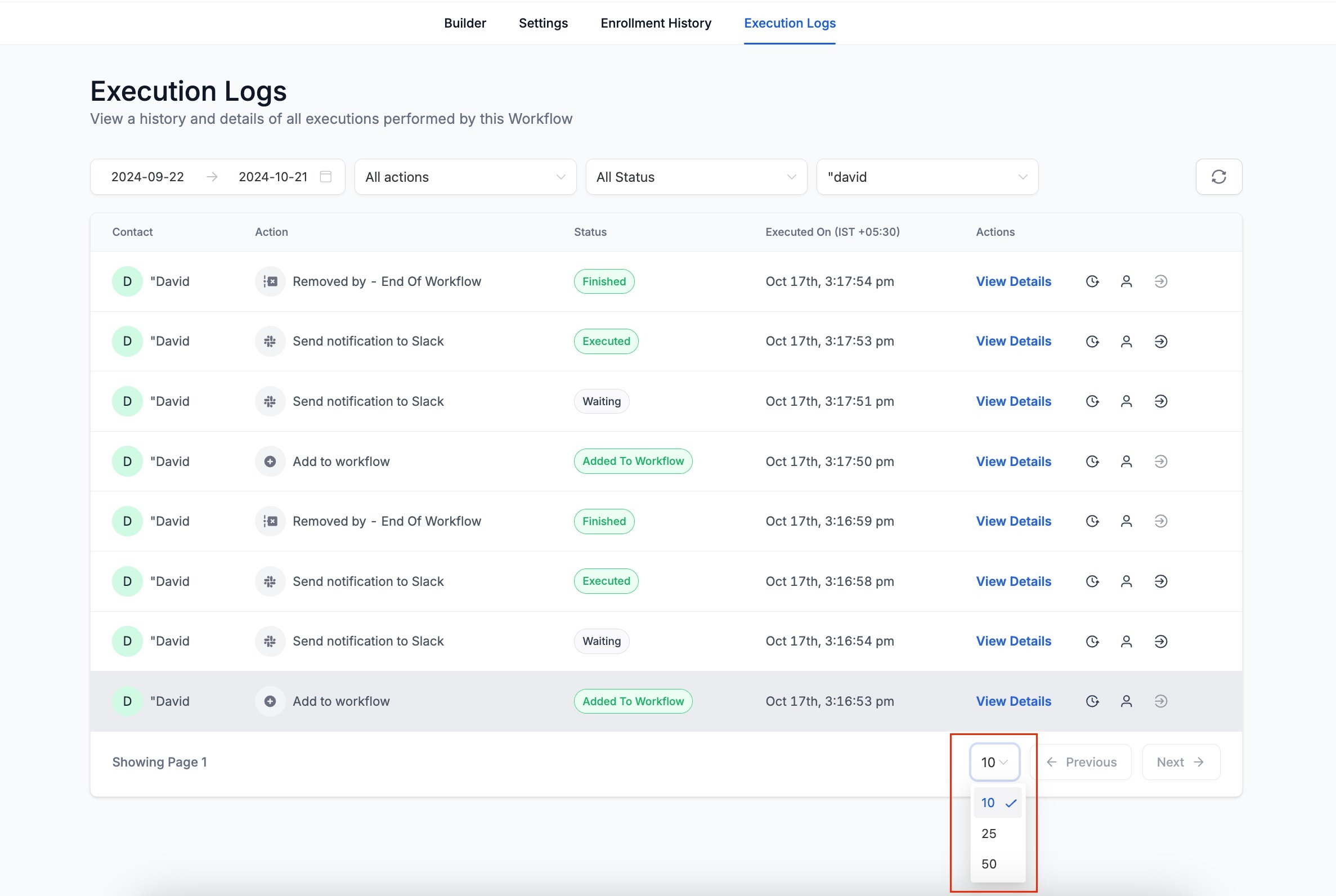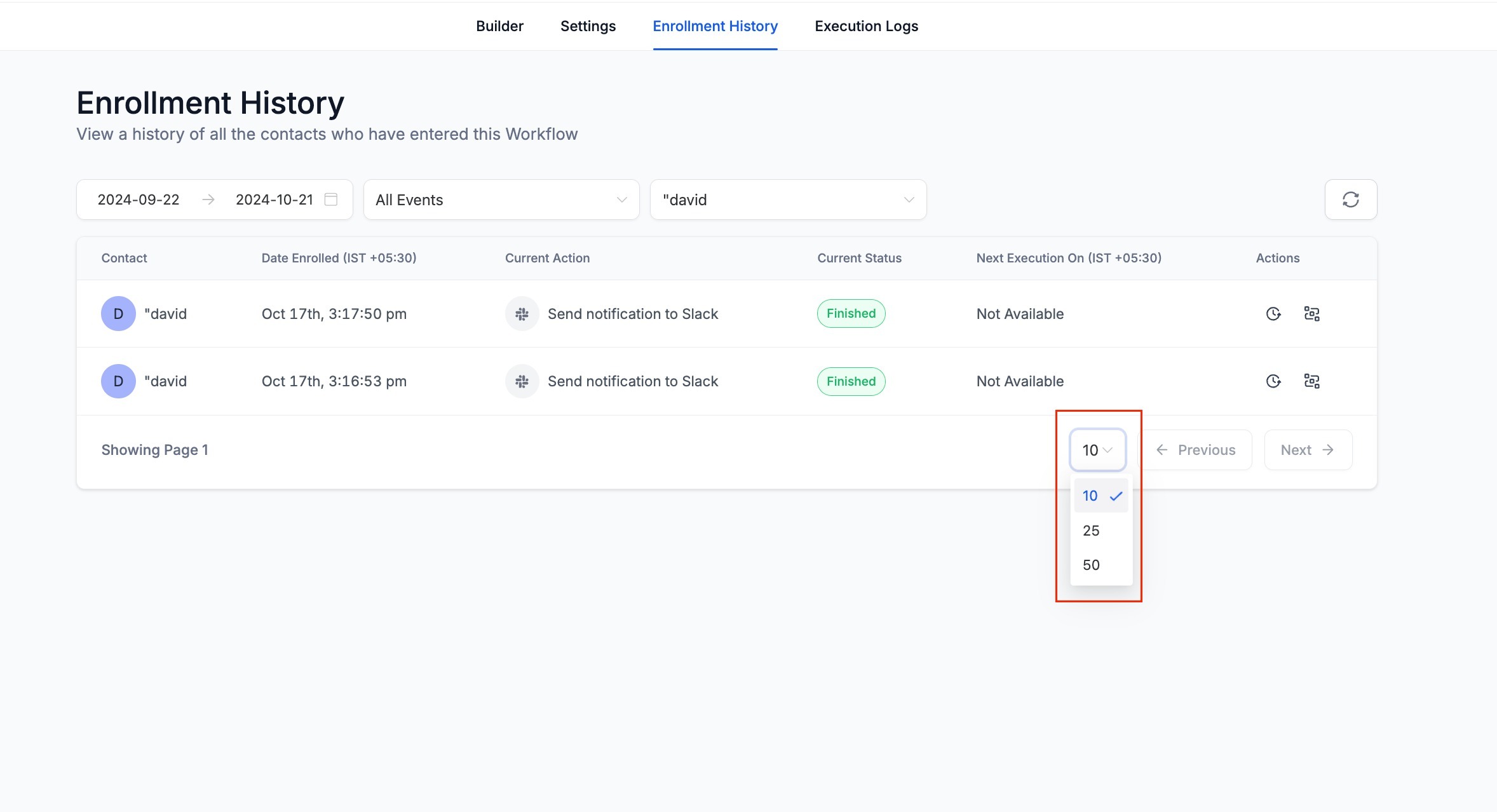 Both the Enrollment History and Execution Logs tabs now support pagination. Users can choose how many row items are displayed per page, with options for 10, 25, or 50 rows at a time. This improves performance and usability for large workflows.