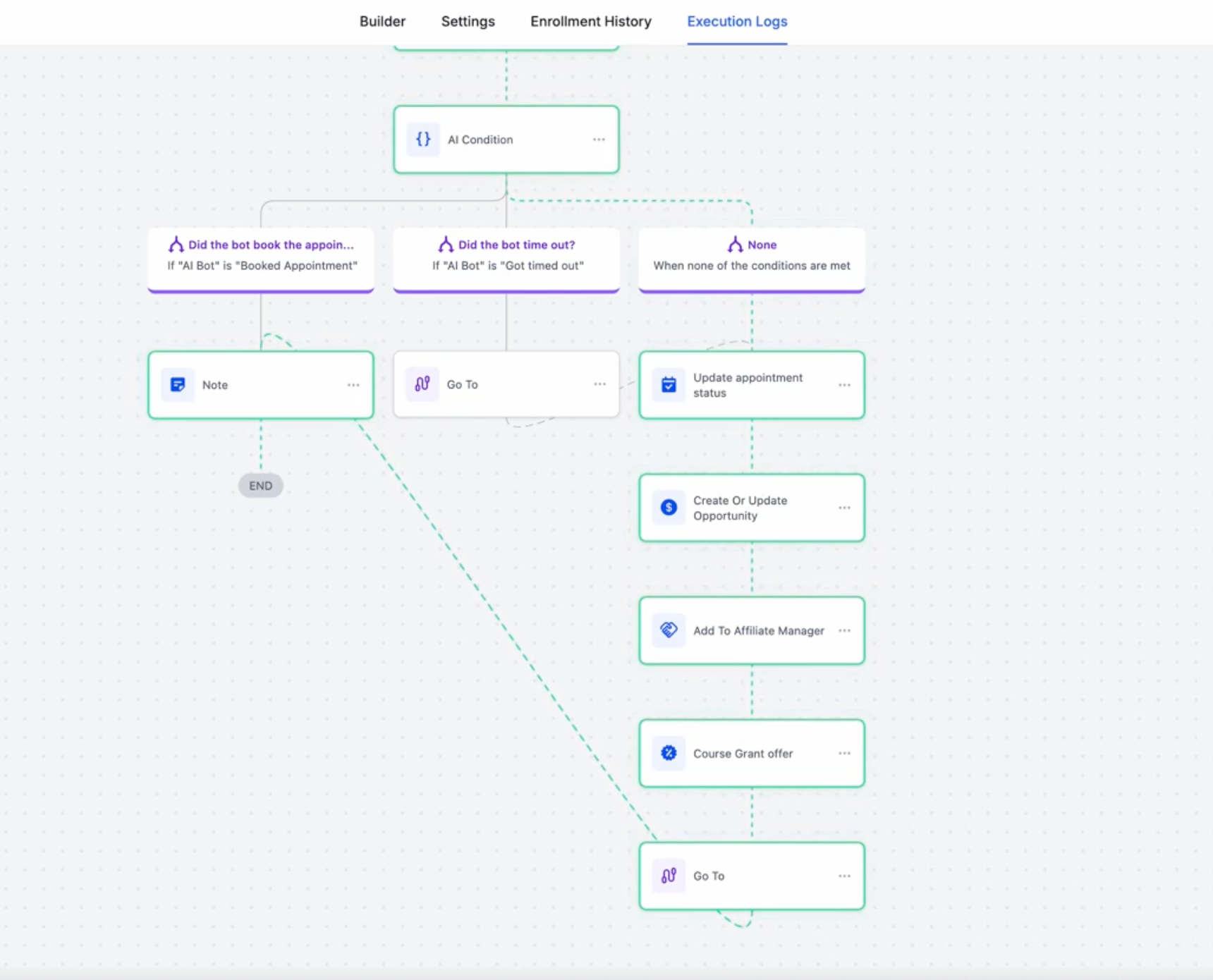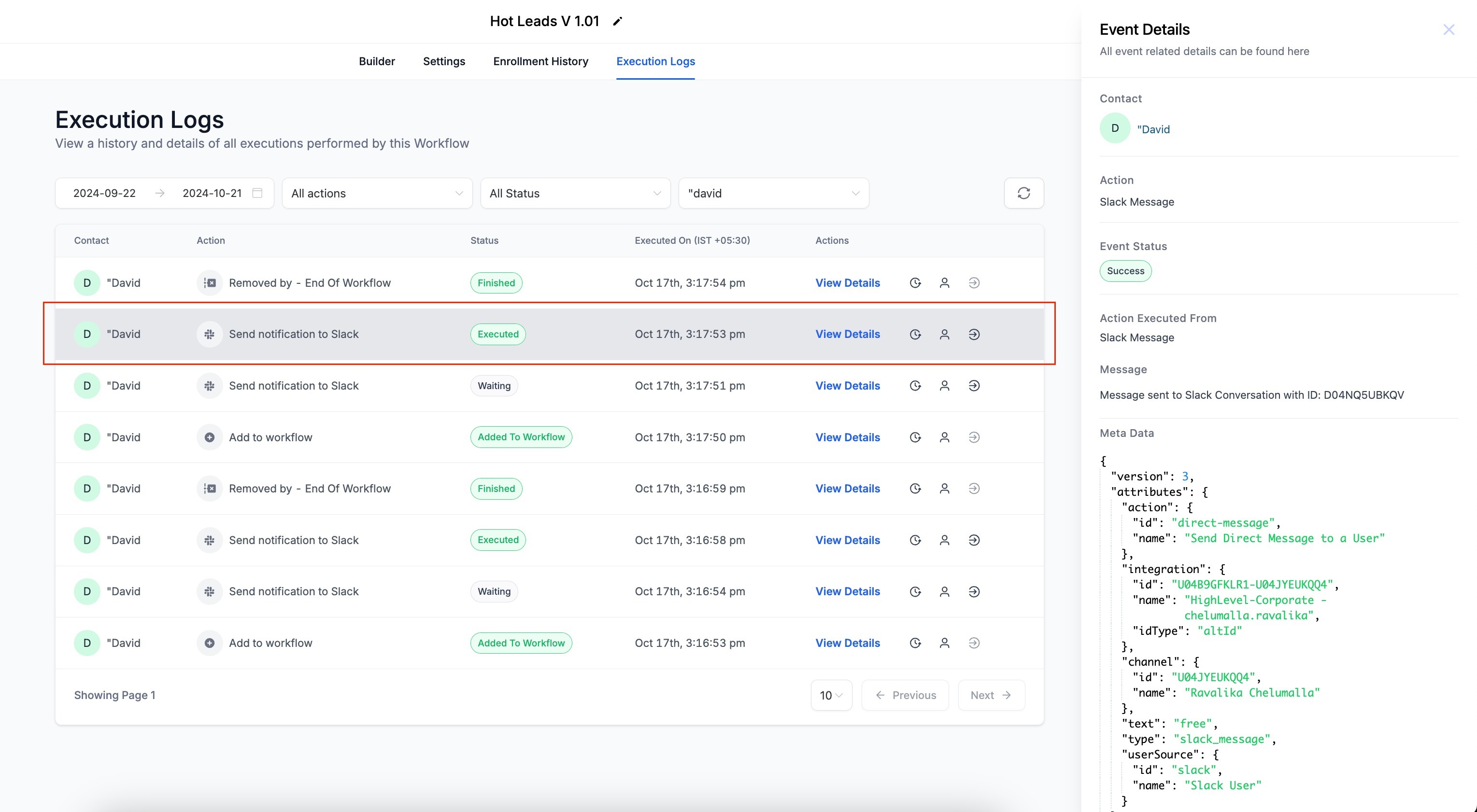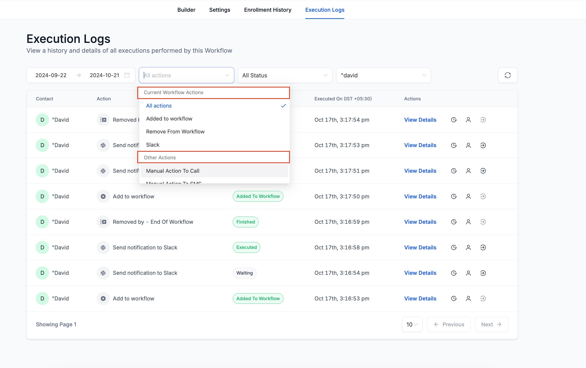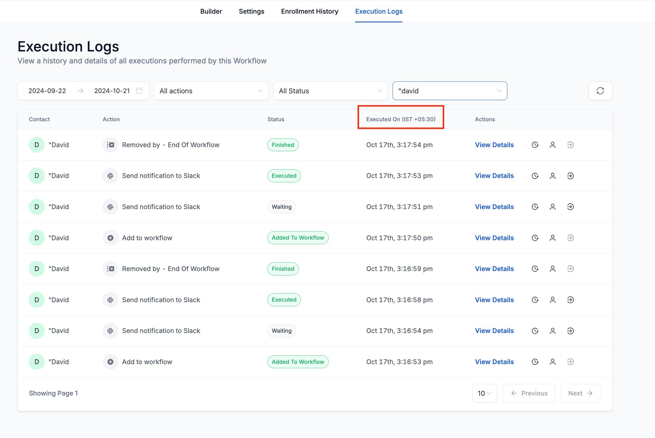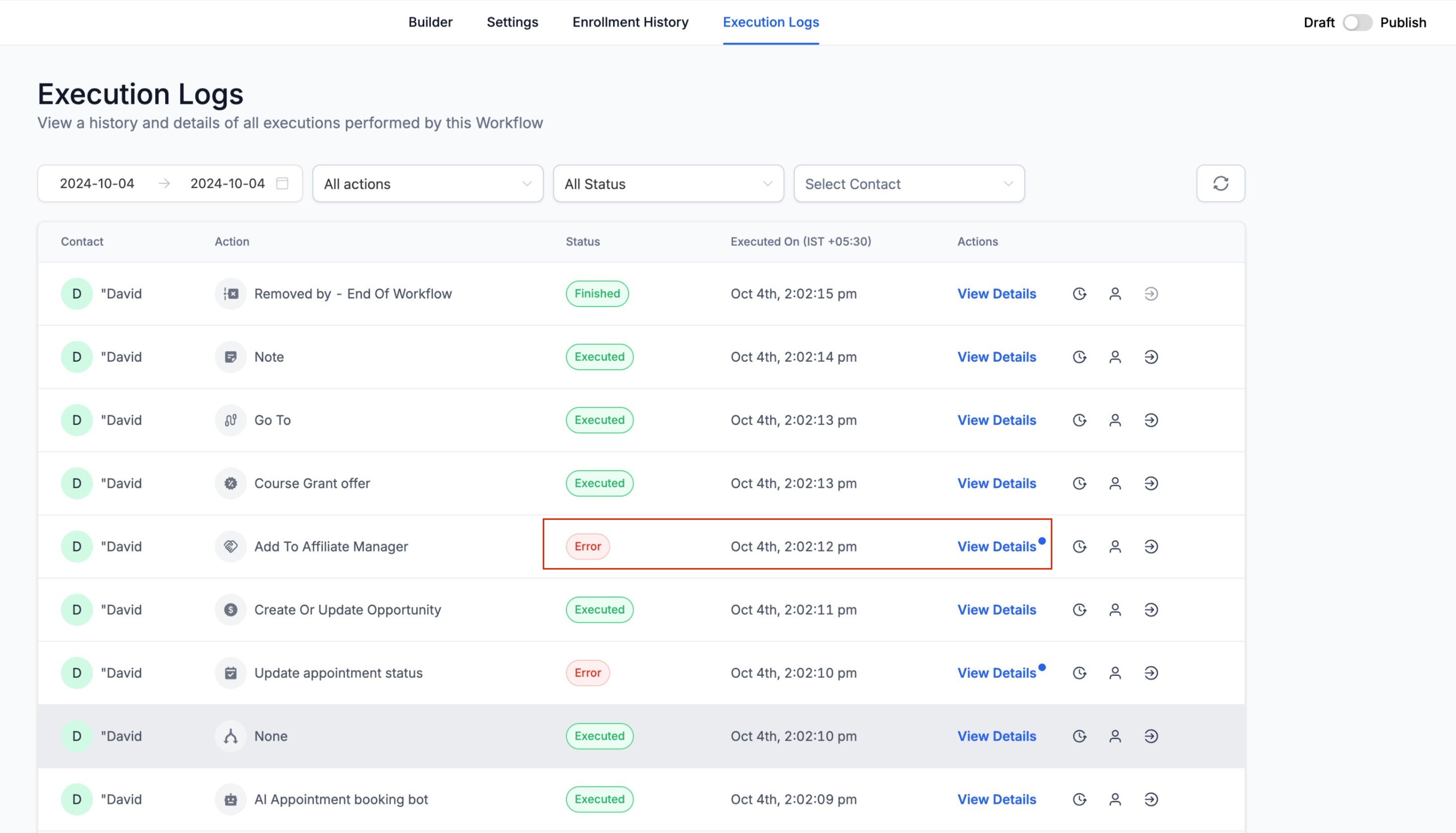 - In the logs all the action executions of the contact will be visible for all the enrollments the contacts have had for this workflow.