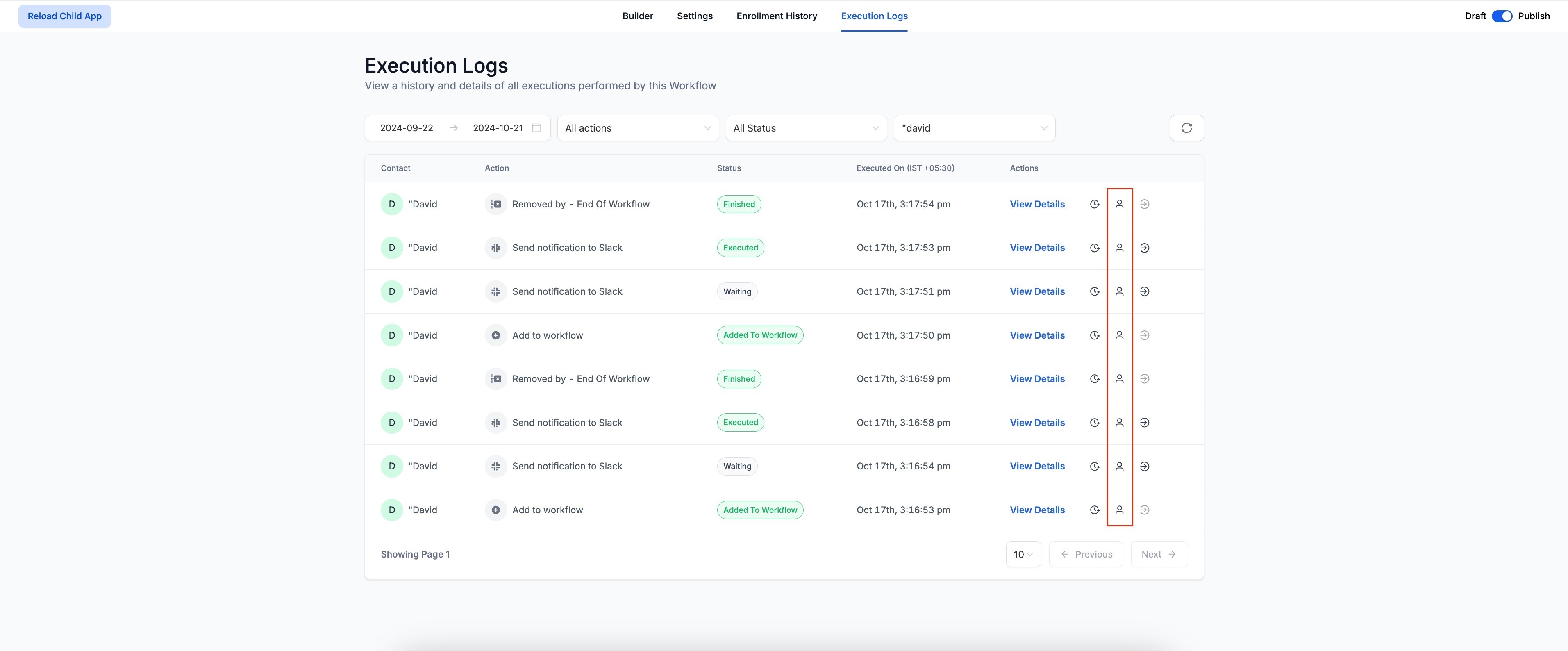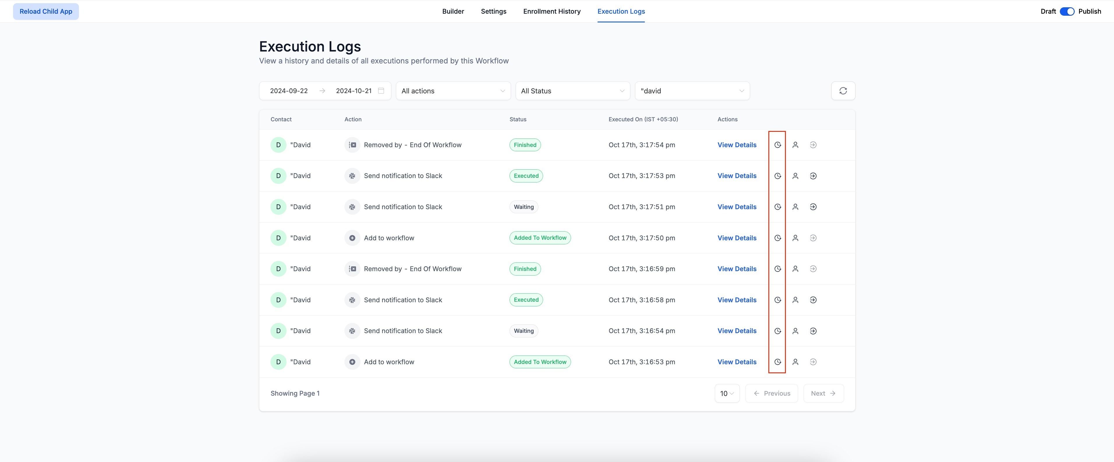 - Users can go to the Contact History. by clicking the "View Contact History" icon in the Execution Logs.