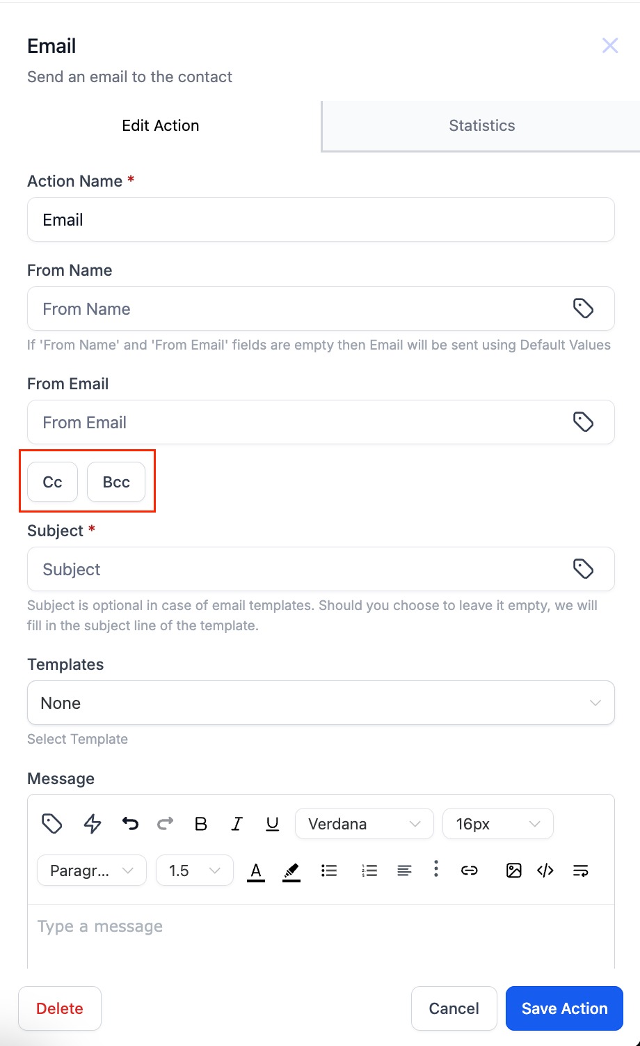 - Add cc/bcc fields in the email action by clicking on the cc/bcc buttons.