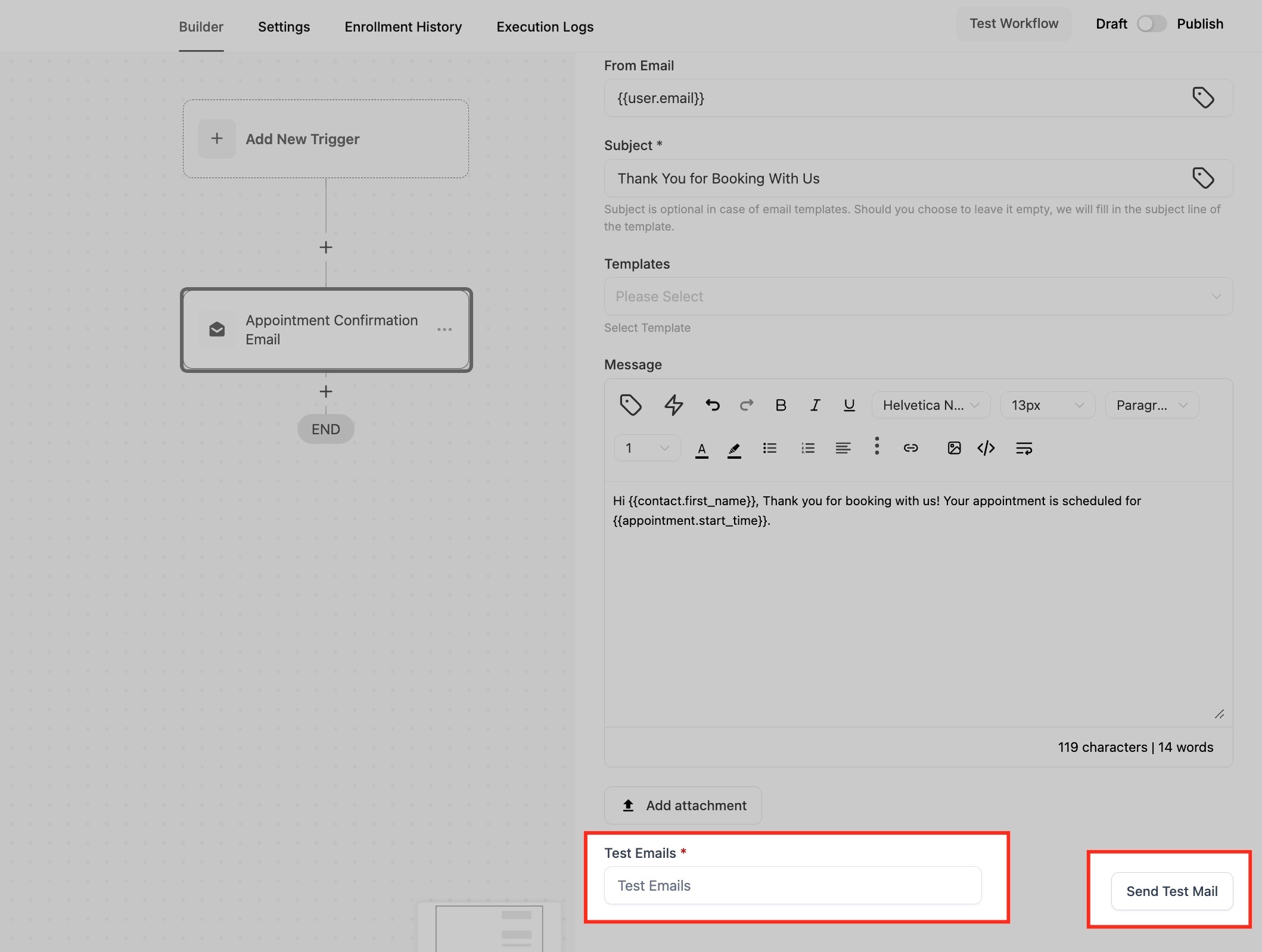 5. Save and Activate: Save the email action in your workflow, and it will automatically be sent when a booking is made.