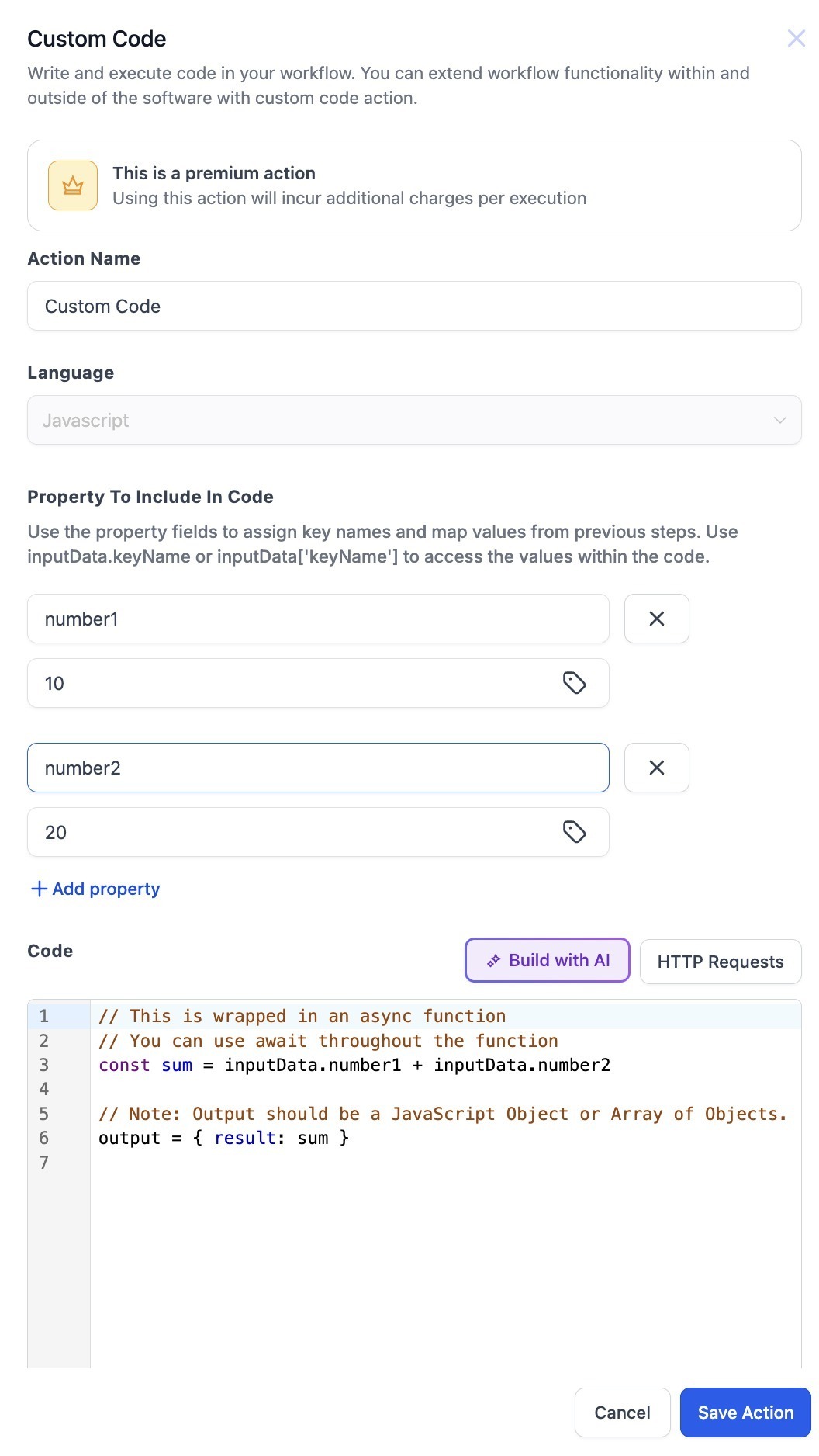 - Select: Choose Custom Code action in your workflow.