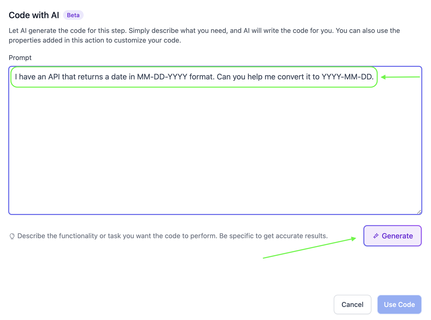 - Describe: Input your desired functionality (e.g., "I have an API that returns a date in MM-DD-YYYY format. Can you help me convert it to YYYY-MM-DD.").