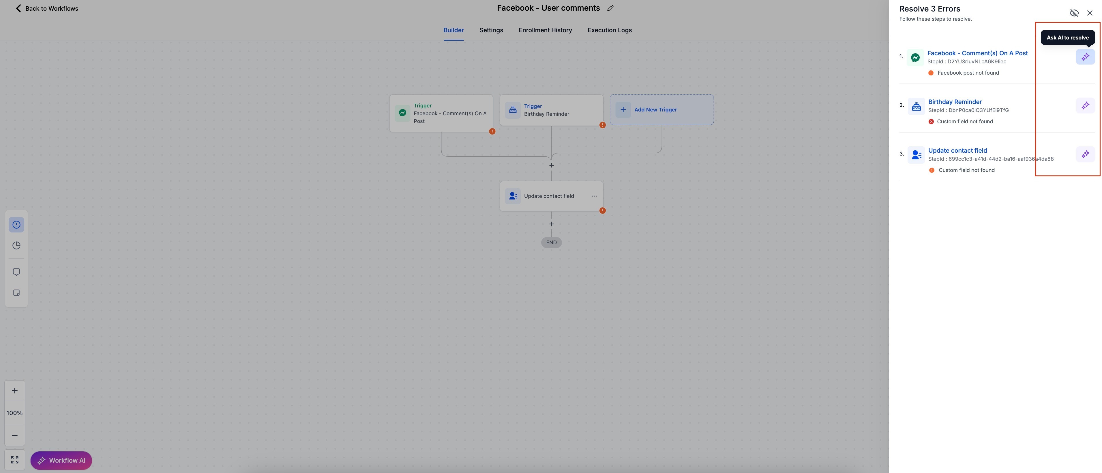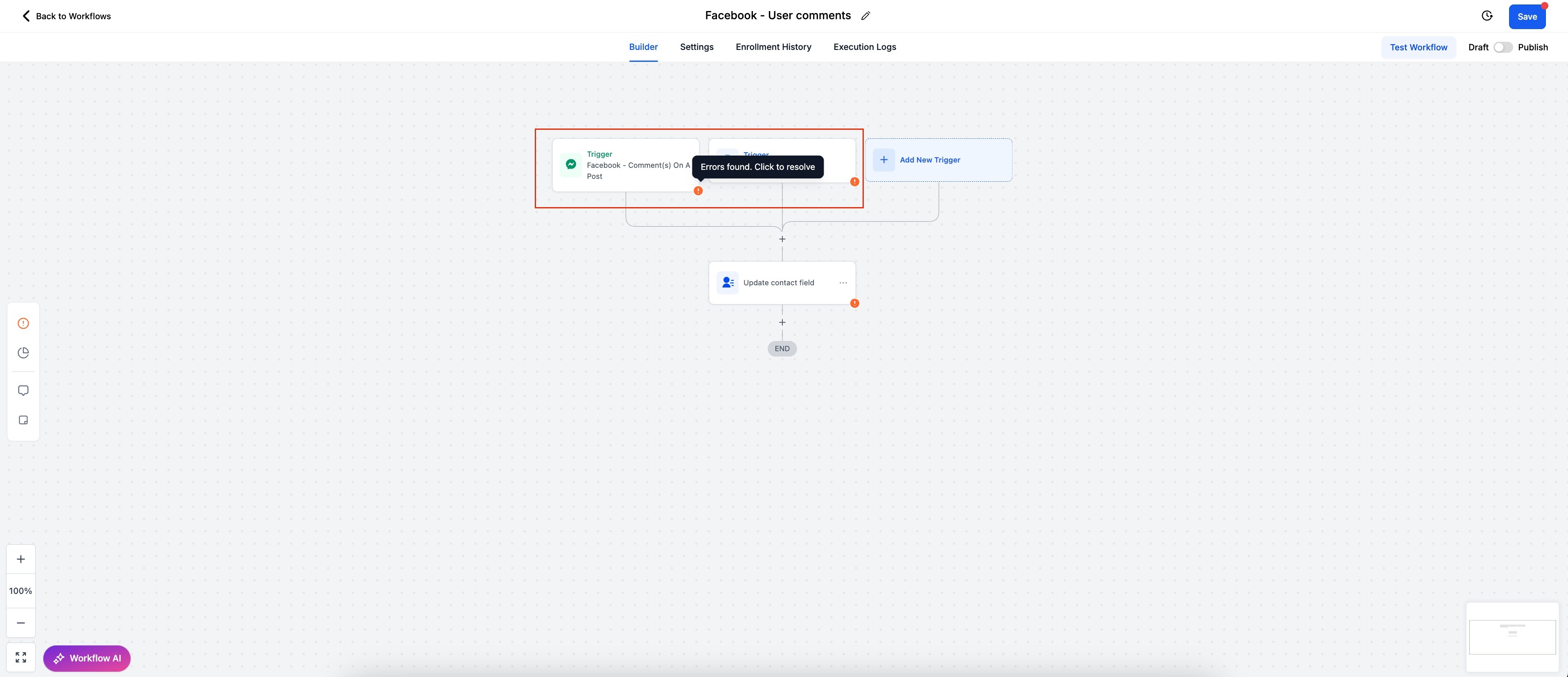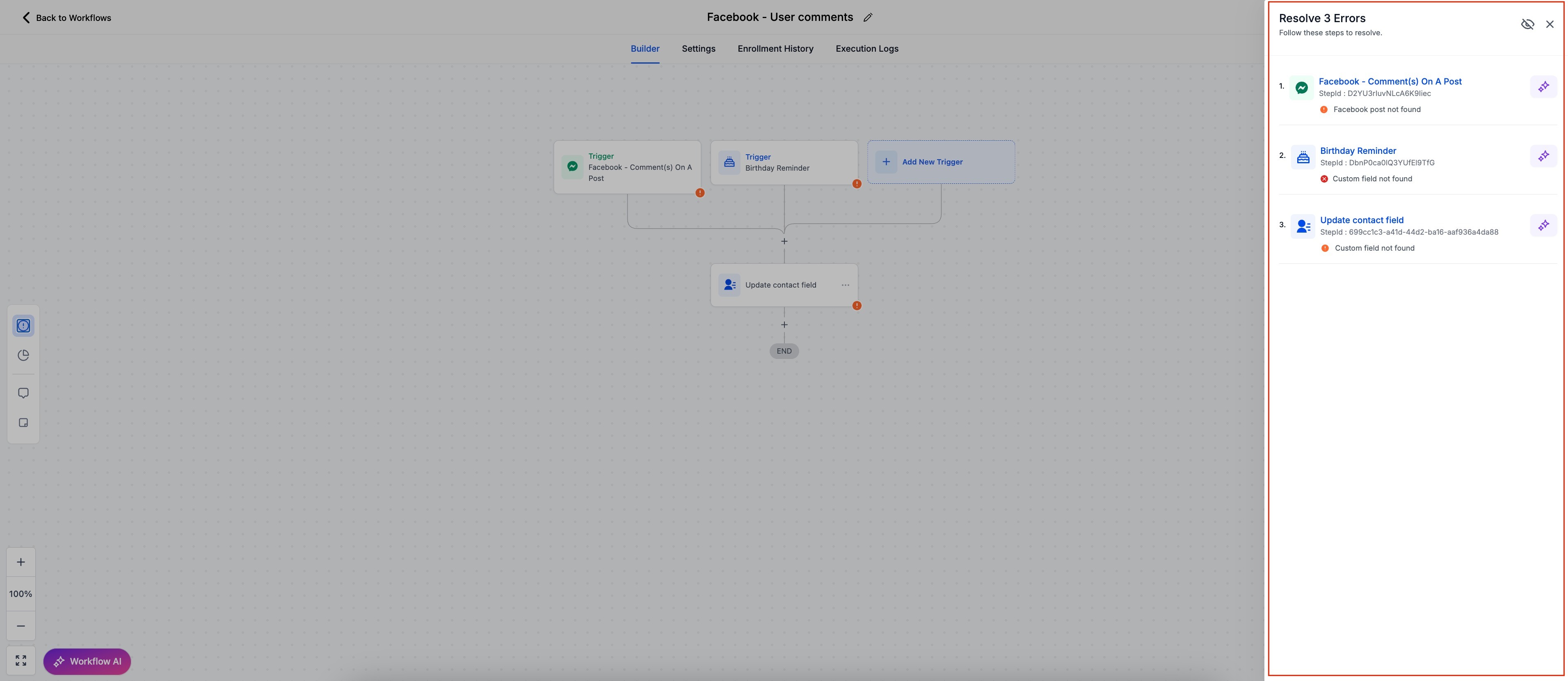 - Errors are highlighted in the Workflow Builder with a ⚠️ Error Icon.