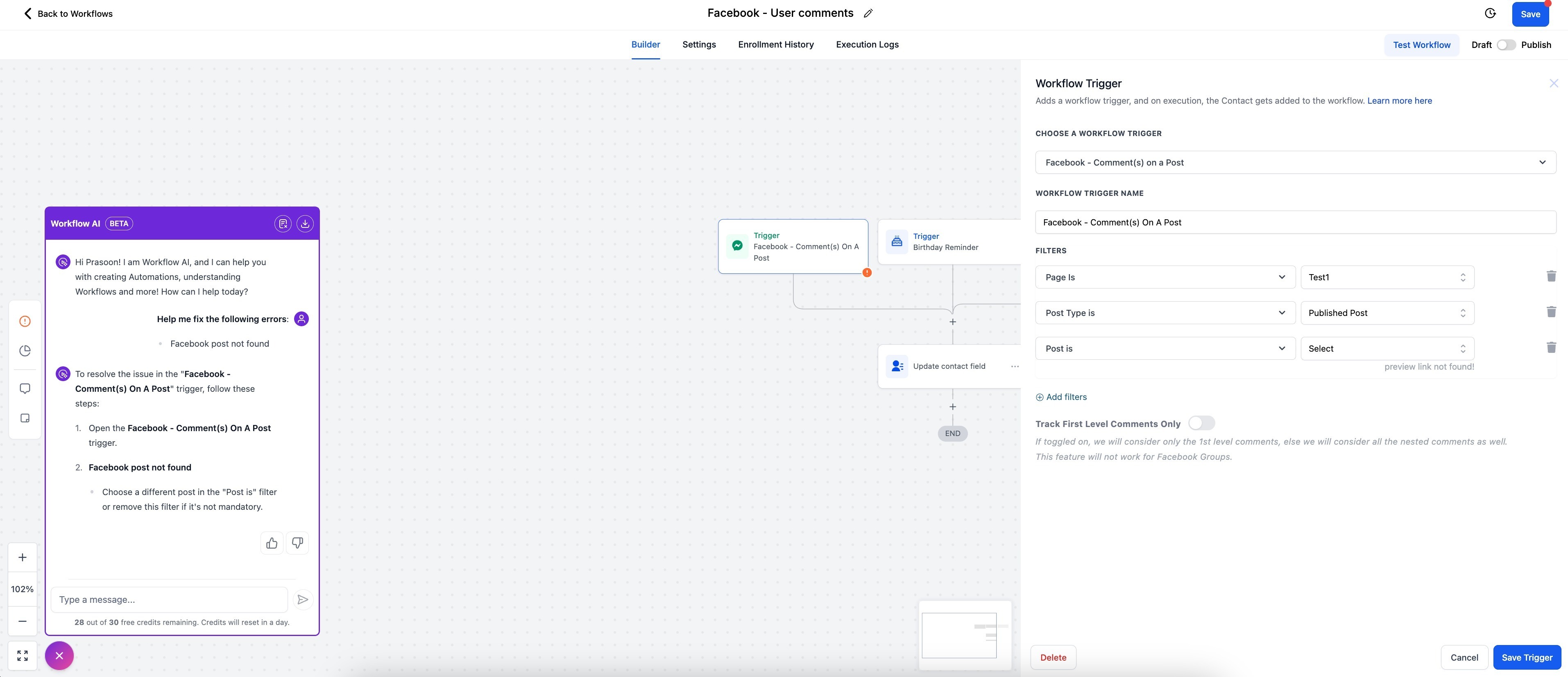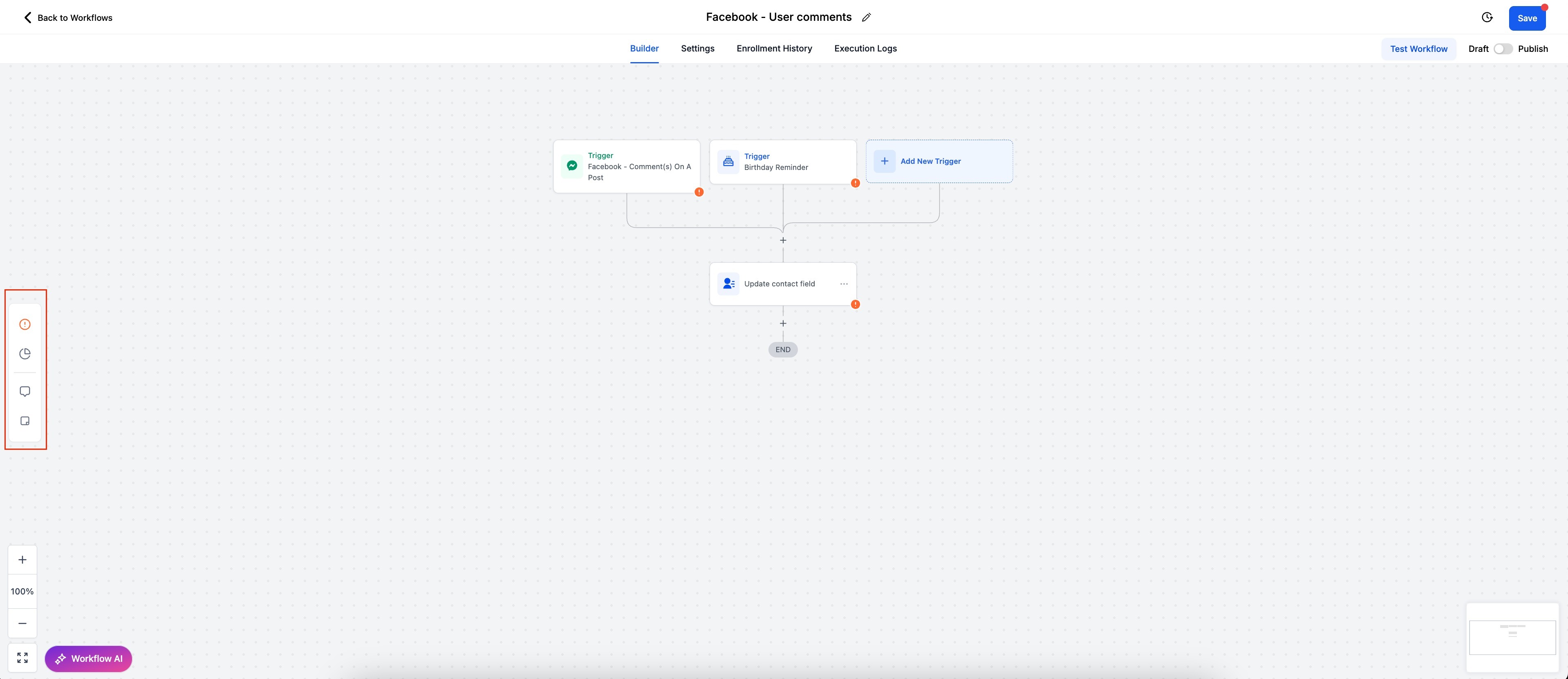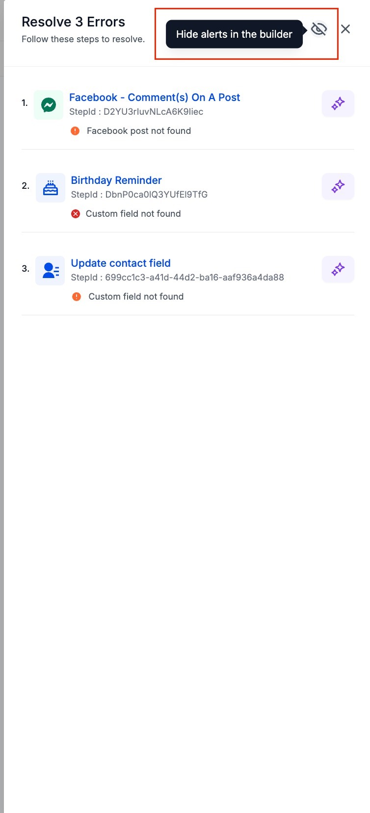 - Errors are highlighted in the Workflow Builder with a ⚠️ Error Icon.