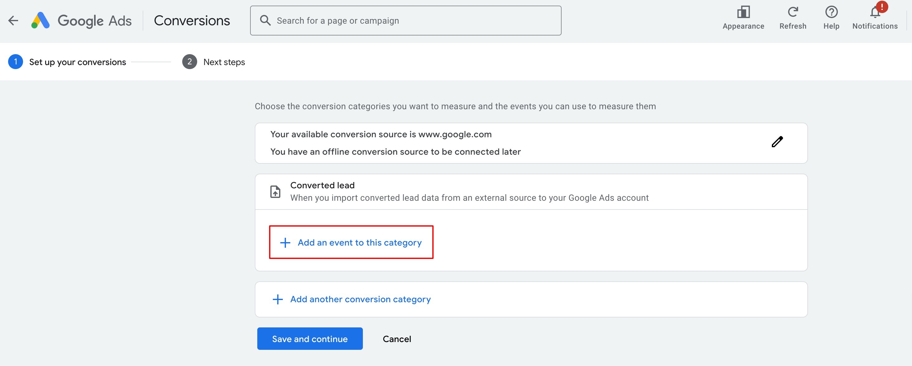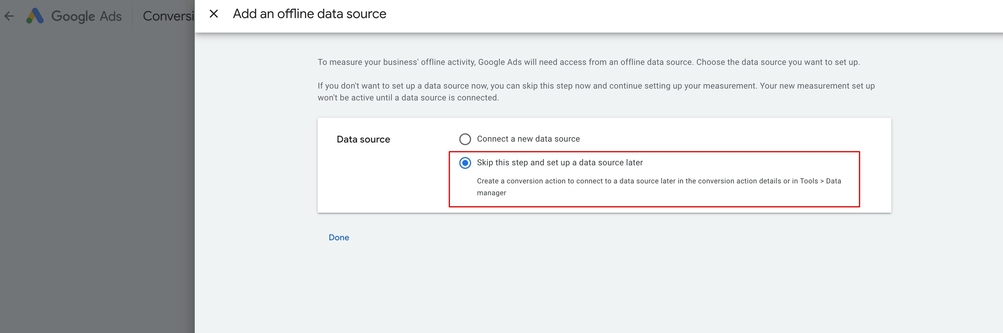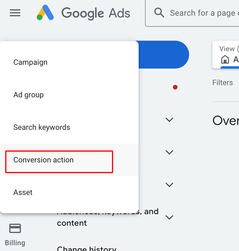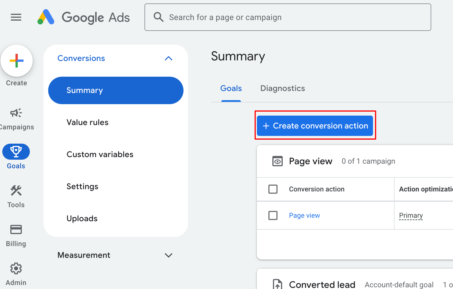 Click on the 'Create' button on top left and select 'Conversion action' to land on the same page as above to create a new conversion action.